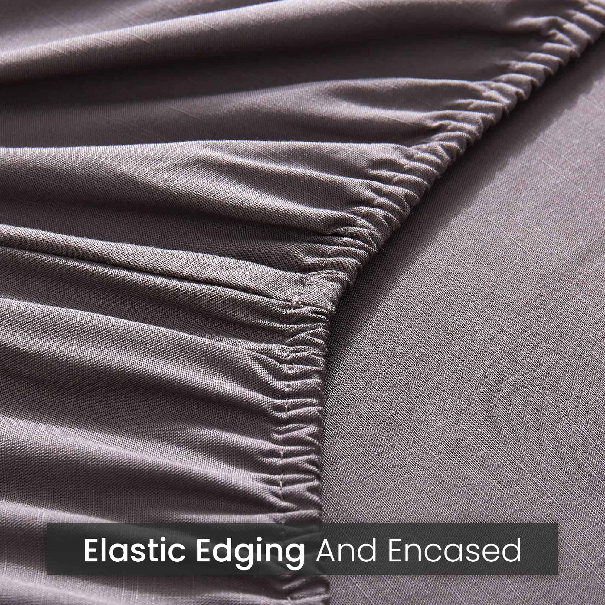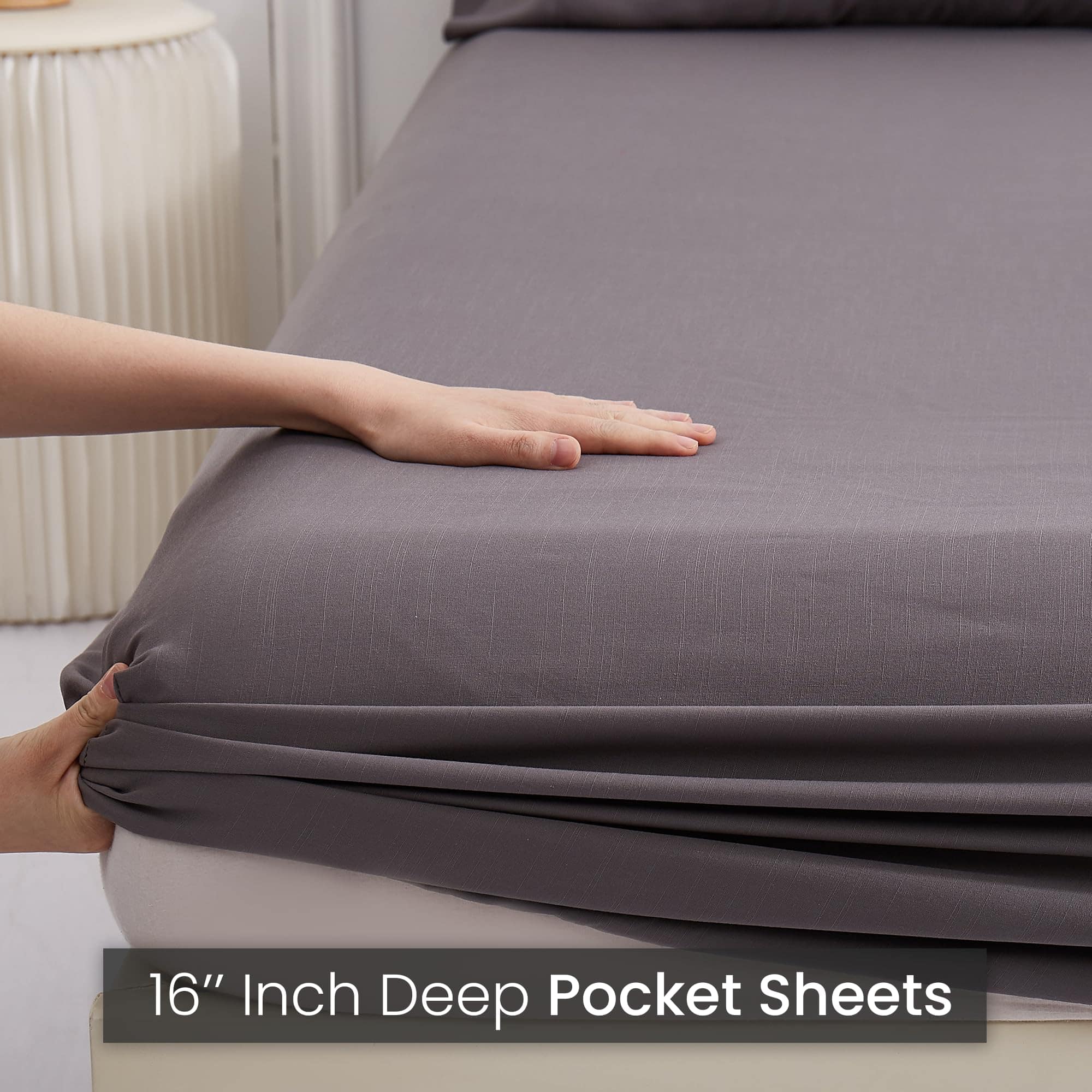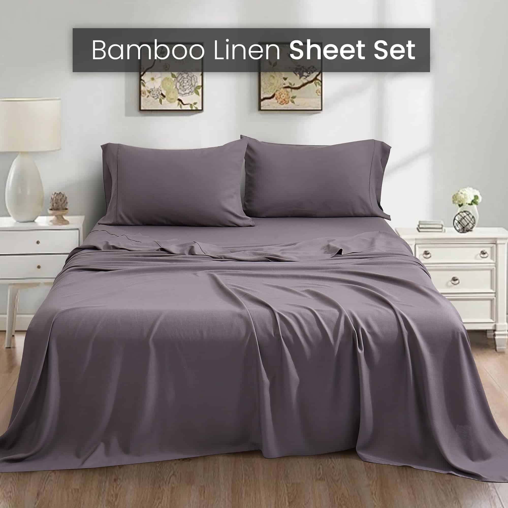 Este juego de sábanas de bambú y lino de la nueva temporada está hecho de 80% rayón y 20% lino, proporcionando comodidad y suavidad. Incluye una sábana ajustable con bolsillo profundo de 15″, una sábana plana y dos fundas de almohada. Disponible en tamaño Queen y en un elegante color gris ceniza.