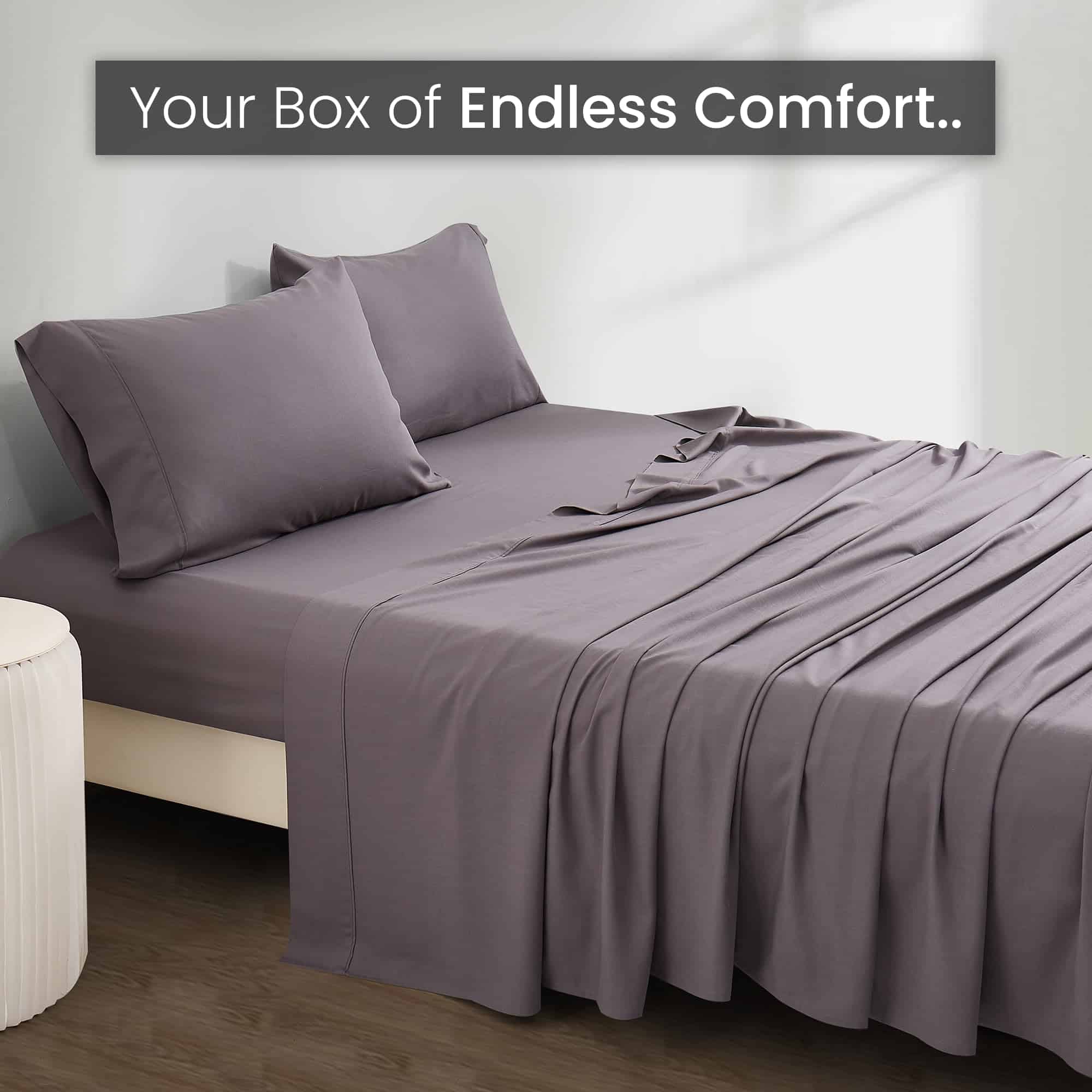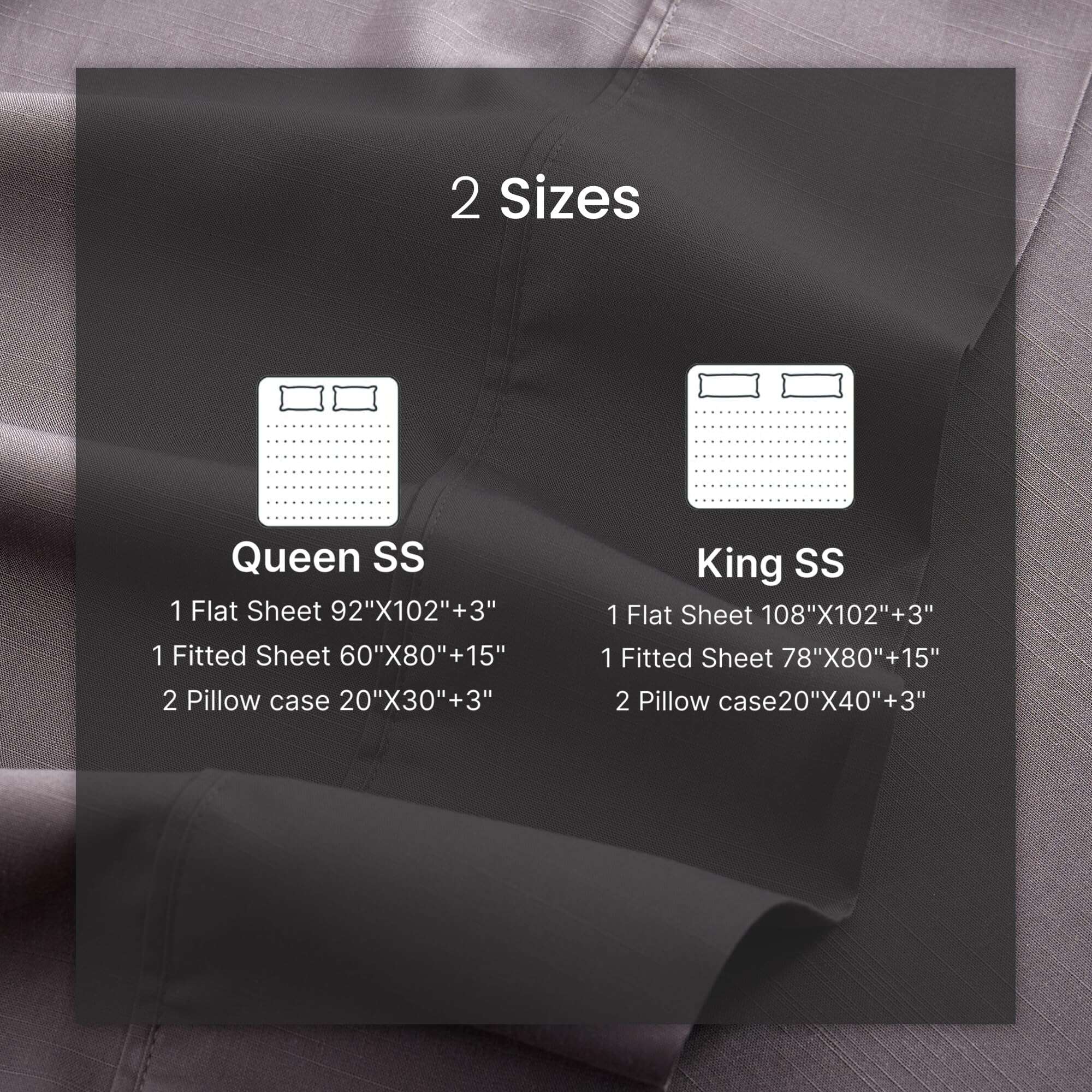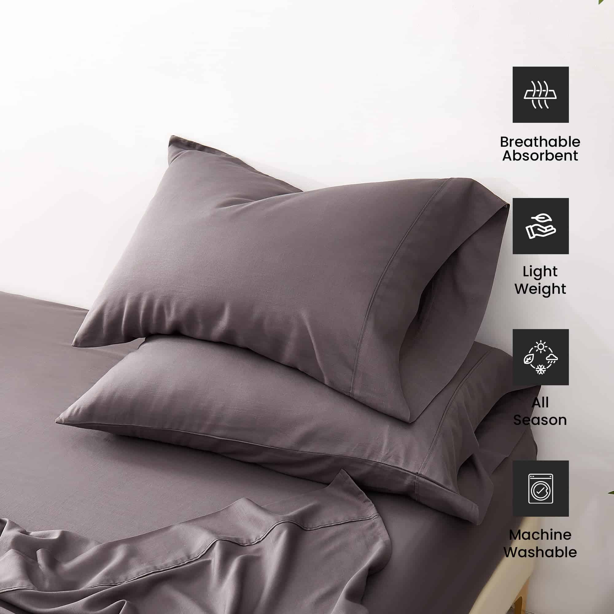 Este juego de sábanas de bambú y lino de la nueva temporada está hecho de 80% rayón y 20% lino, proporcionando comodidad y suavidad. Incluye una sábana ajustable con bolsillo profundo de 15″, una sábana plana y dos fundas de almohada. Disponible en tamaño Queen y en un elegante color gris ceniza.
