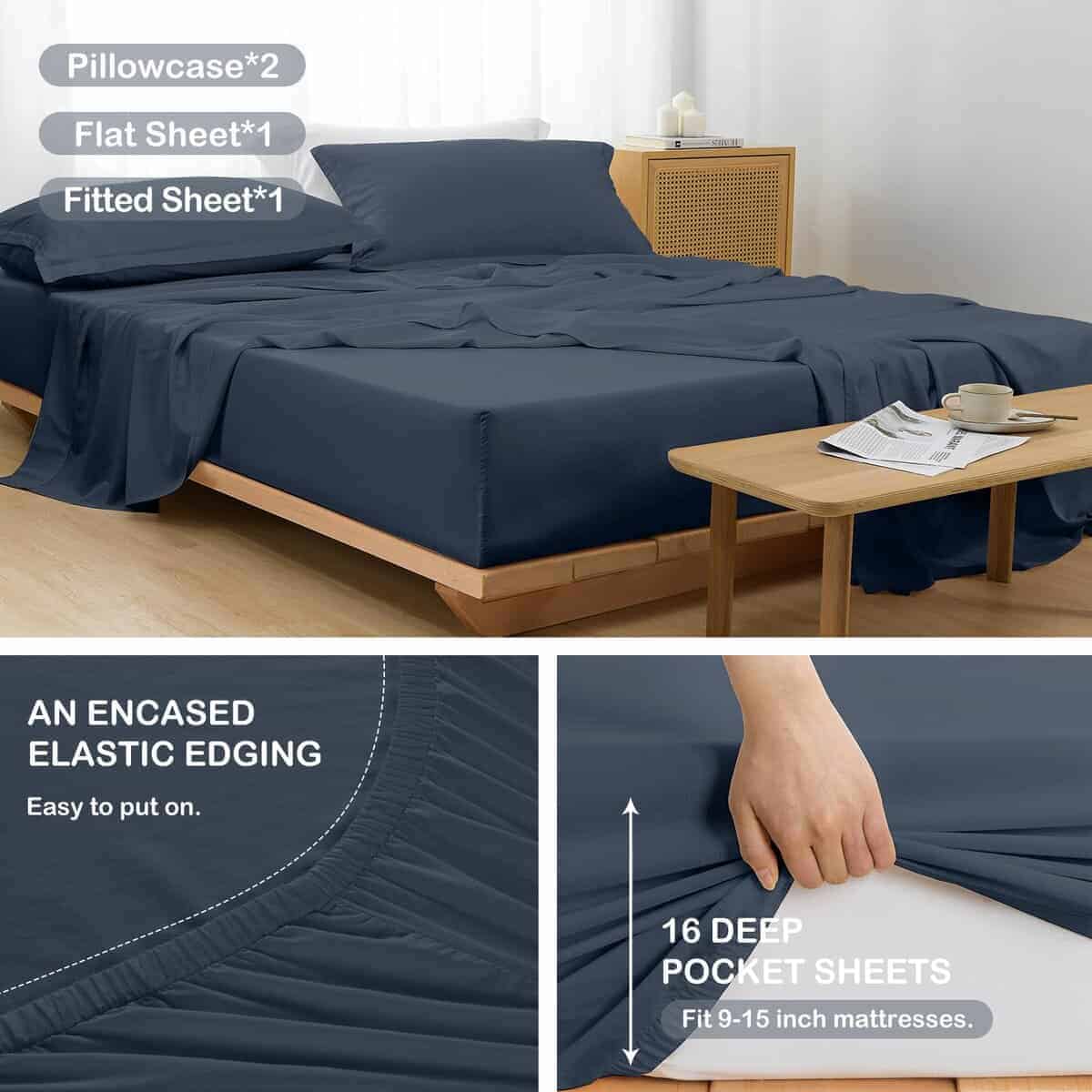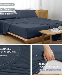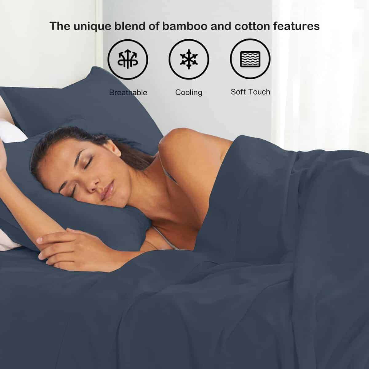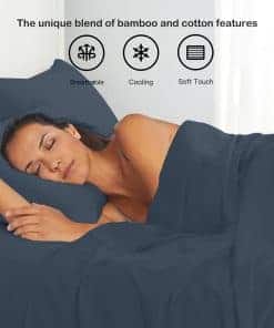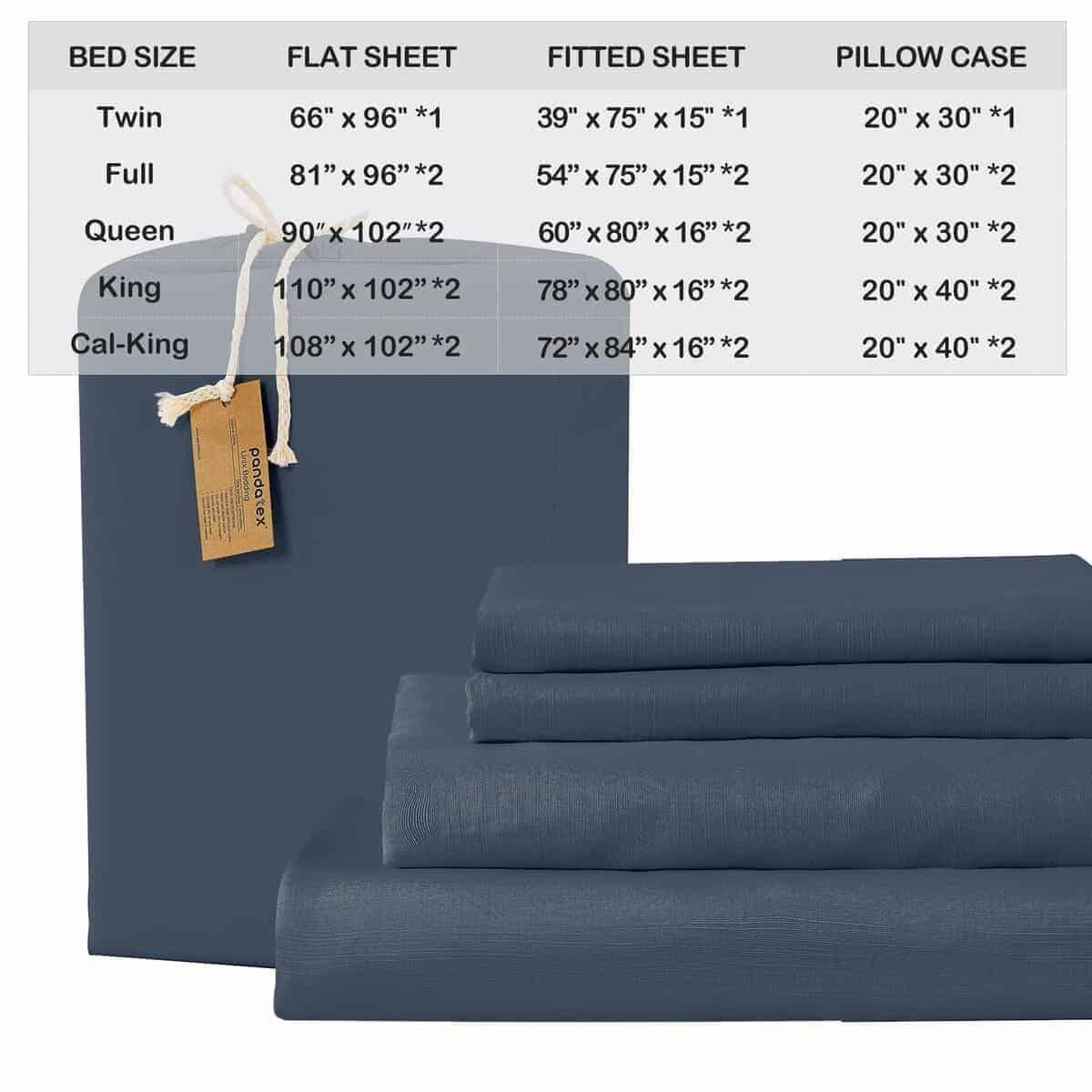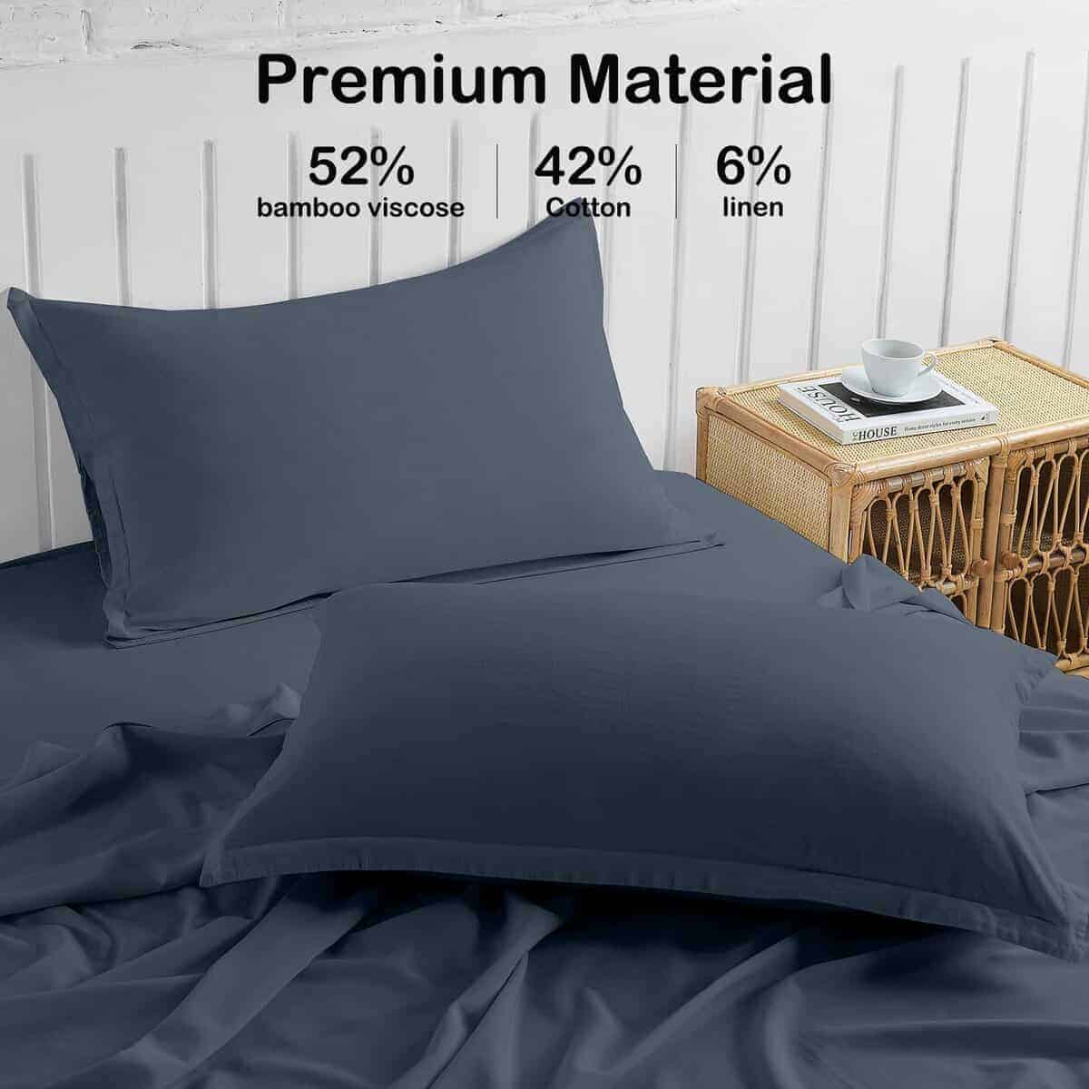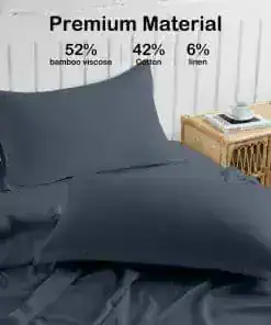 1. Material Premium: Hecho de 52% viscosa de bambú, 42% algodón slub y 6% lino en 300 hilos. Con esta mezcla única, este juego de sábanas combina los valores de los dos materiales y crea una sorprendente calidad y textura similar al lino, haciéndolo una elección ideal para dormir durante todo el año. 2. Detalles Conscientes: Tejido de percal sólido, para crear esa sensación fresca y transpirable y se ajusta bien. Los recortes de tela se cosen en una bolsa reutilizable con cordón para el empaque. La sábana bajera con bolsillo profundo de 16″ se ajusta a colchones de 9-16″ pulgadas. 3. Beneficios Naturales: La mezcla única de viscosa de bambú y algodón proporciona a este juego de sábanas los beneficios de los tres materiales, ya que la viscosa de bambú es suave y fresca, el algodón es transpirable y el lino cuenta con una mejor durabilidad. 4. Cuidado de Lavandería: Lavar a máquina solo en agua fría. Ciclo delicado. Sin lejía. Secar a baja temperatura. Retirar inmediatamente después del centrifugado. Presionar con plancha tibia si es necesario. 5. Mejora del Sueño: La estructura de nuestras sábanas puede absorber el sudor y la humedad, haciéndola una mejor opción para los durmientes calurosos, y no será demasiado fría en invierno, haciéndola una buena elección para todas las estaciones.