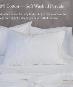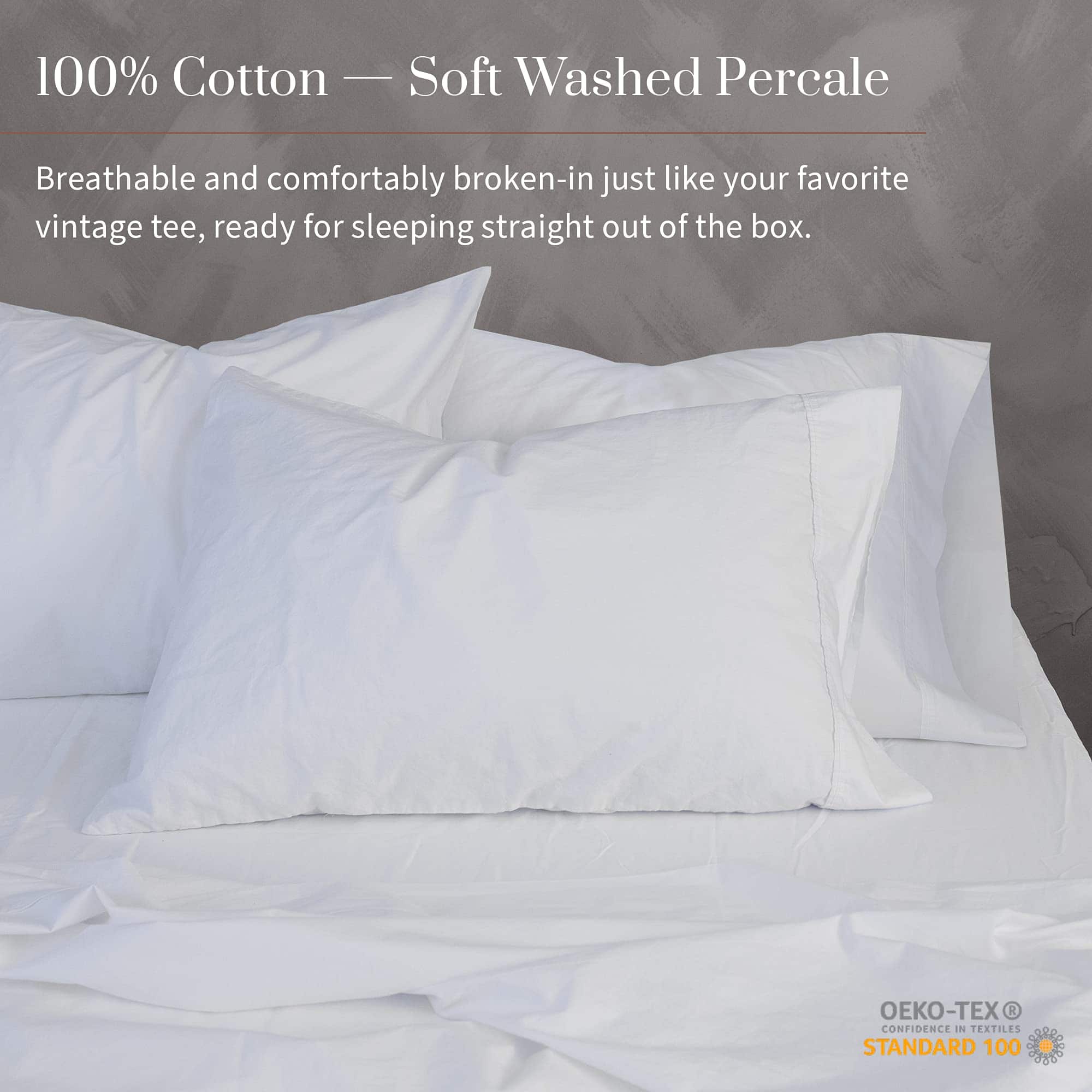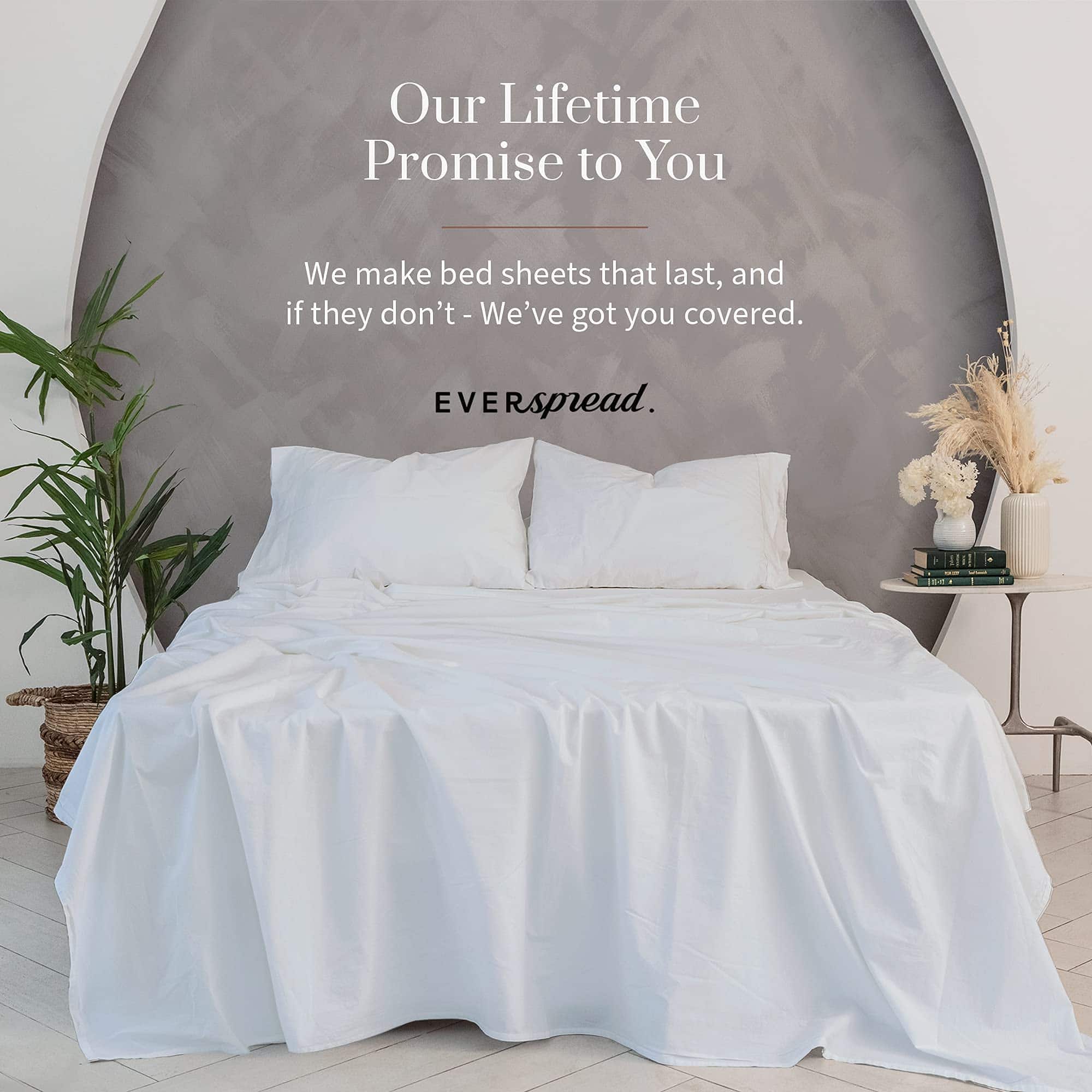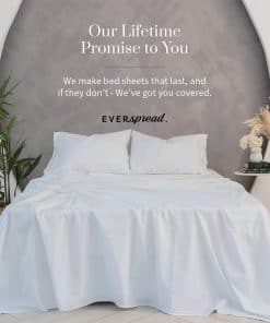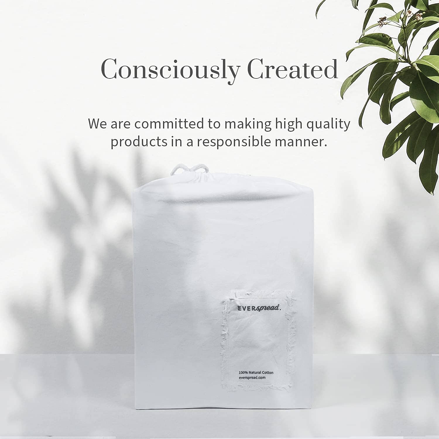 Sábanas de percal lavadas suaves 100% algodón de fibra larga. La mezcla perfecta entre la frescura de las sábanas de percal de hotel y la sensación sedosa del satén lustroso. Cómodamente desgastadas como tu camiseta vintage favorita, directamente de la caja. Puedes confiar en que tus sábanas no se pillen, se desgasten o se decoloren, sino que solo se vuelvan más acogedoras después de cada lavado. Etiquetas cortas y largas en los lados. Colocadas cuidadosamente en el interior de tus sábanas ajustables para hacer el proceso de hacer la cama más rápido y fácil. Nuestra sábana ajustable está diseñada con costuras duraderas y un elástico elástico que se estira alrededor para asegurarse de que se ajuste de forma segura a tu colchón. La sábana ajustable de bolsillo profundo se adapta a colchones de hasta 18 pulgadas de altura. Medida de sostenibilidad: En Everspread, creemos que es nuestro deber y responsabilidad comprometernos con la sostenibilidad. Nuestras medidas de sostenibilidad se centran en el suministro de materiales producidos naturalmente, trabajar con fábricas éticas y crear envases reciclables y reutilizables para eliminar cualquier uso de plástico de un solo uso. Desde el principio hasta el final, nos comprometemos a hacer productos de alta calidad de manera responsable. Garantía eterna. En Everspread, estamos dedicados a ofrecer la mejor experiencia de producto posible. Nos esforzamos por hacer productos que duren. Si no lo hacen, estás cubierto. Esta es nuestra promesa de por vida para ti. Preguntas. Nuestro Equipo de Atención al Cliente dedicado está aquí para apoyarte durante toda tu experiencia con Everspread.