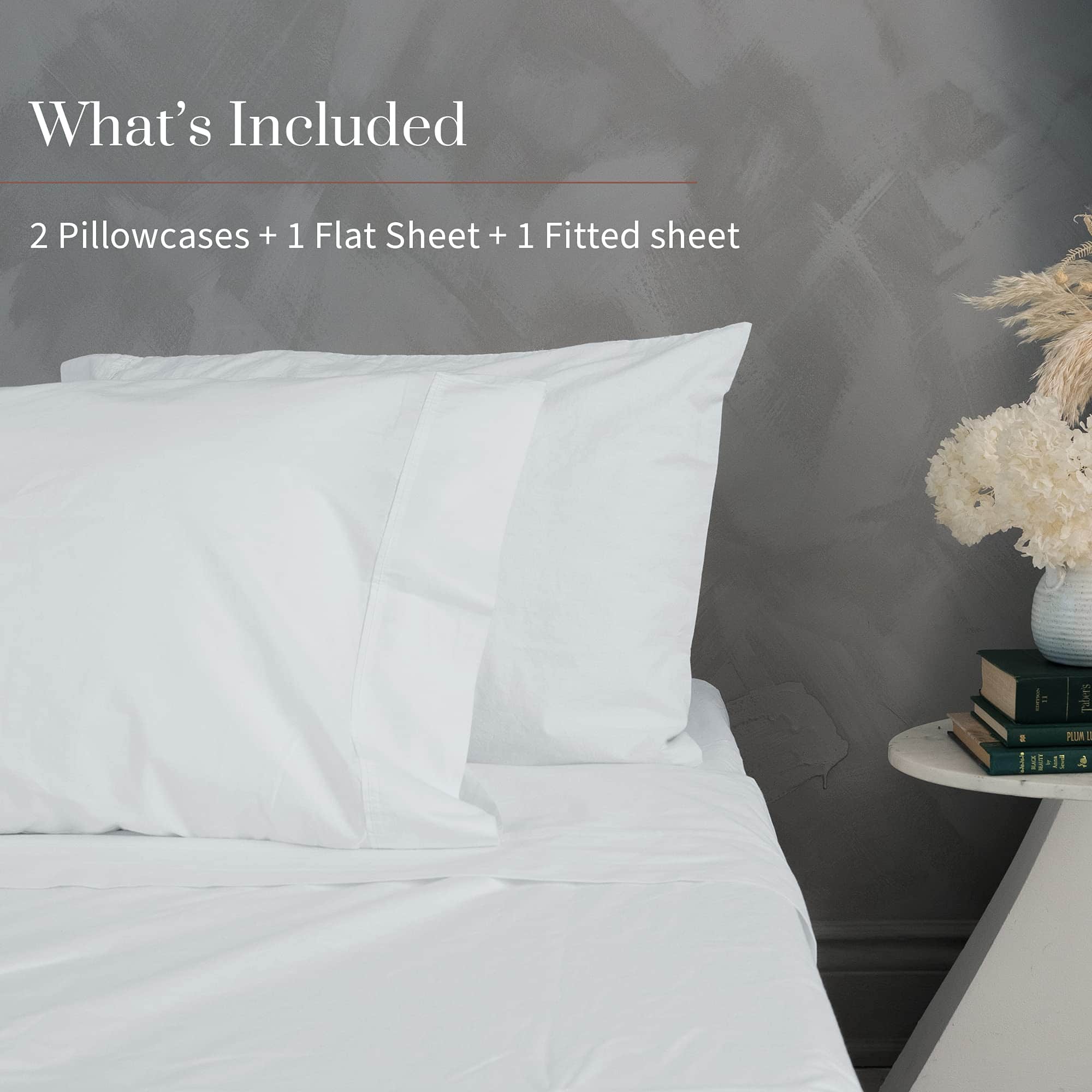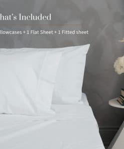 Nuestro Juego de Sábanas de Algodón Tamaño Completo de 4 Piezas incluye 1 Sábana Plana (81″ x 96″), 1 Sábana Ajustable (54″ x 75″ x 18″), 2 Fundas de Almohada (20″ x 30″), y 1 Bolsa de Algodón Suave con Cordón.