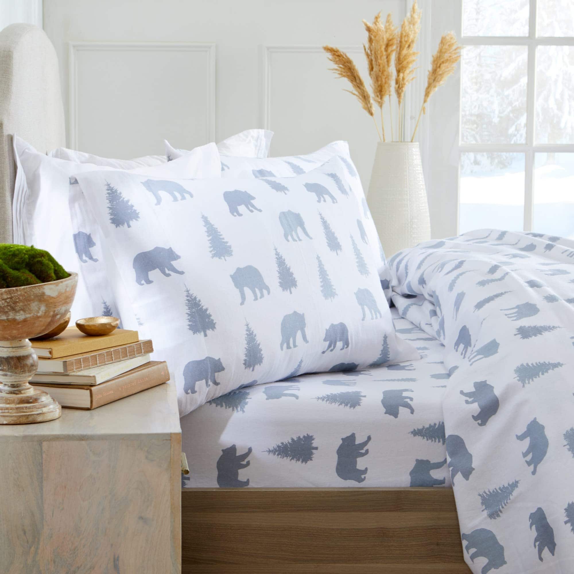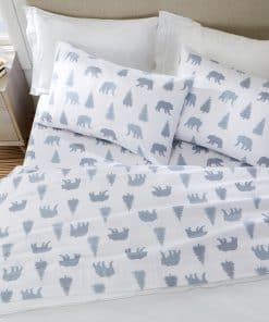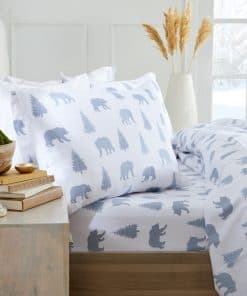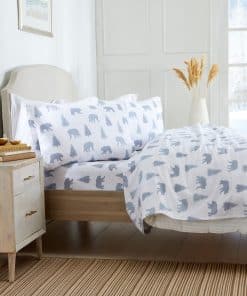Juego de sábanas de franela 100% algodón turco de la marca Market & Place. Estas sábanas de alta calidad están fabricadas con franela de algodón turco para brindar máxima suavidad y calidez. La construcción transpirable las hace perfectas para su uso durante todo el año. La tela de pincel doble garantiza una sensación ultra suave y acogedora al tacto. El diseño presenta un encantador estampado de osos en varios tonos de gris sobre un fondo blanco, lo que las convierte en el regalo perfecto para bodas, cumpleaños, navidades y más. Cada juego incluye una sábana ajustable totalmente elástica para asegurar un ajuste perfecto a tu colchón y ofrece una cobertura segura. Las sábanas ajustables de bolsillo profundo pueden adaptarse a camas de hasta 18 pulgadas de grosor. El juego de tamaño Twin incluye una Sábana Ajustable (75 x 39″), una Sábana Plana (96 x 66″), y una Funda de Almohada Estándar (20 x 30″). Para mantenerlas en óptimas condiciones, se recomienda lavarlas a máquina en frío y secar a baja temperatura. Disfruta de la durabilidad y la comodidad que estas sábanas de Market & Place te brindarán.