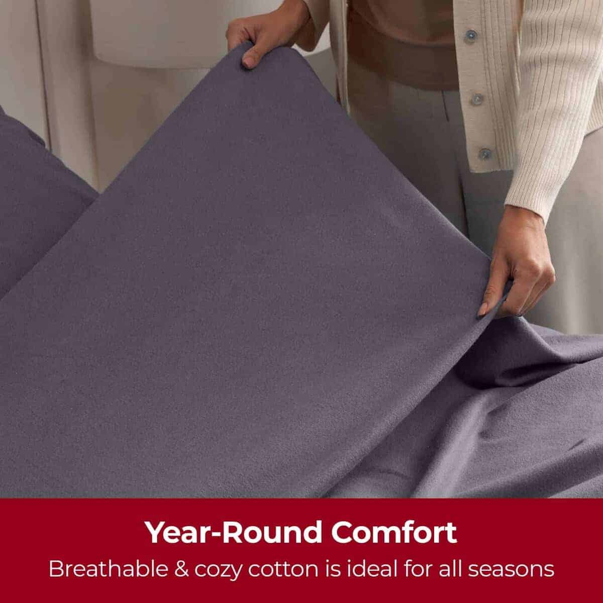 1. 100% algodón de franela ultraligero. El tejido de franela de 160 g de Mellanni proporciona calor adicional sin peso excesivo/sudores nocturnos. El algodón 100% natural se va desprendiendo con cada lavado. Ideal para primavera, otoño e invierno.