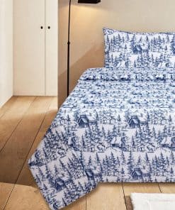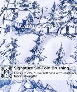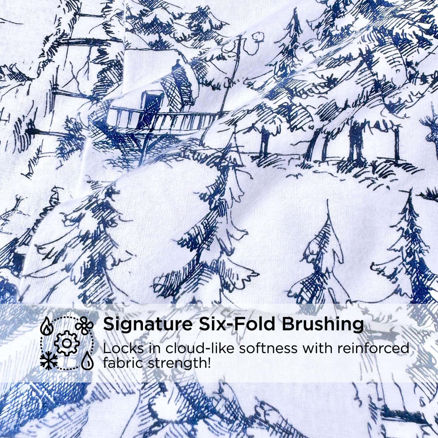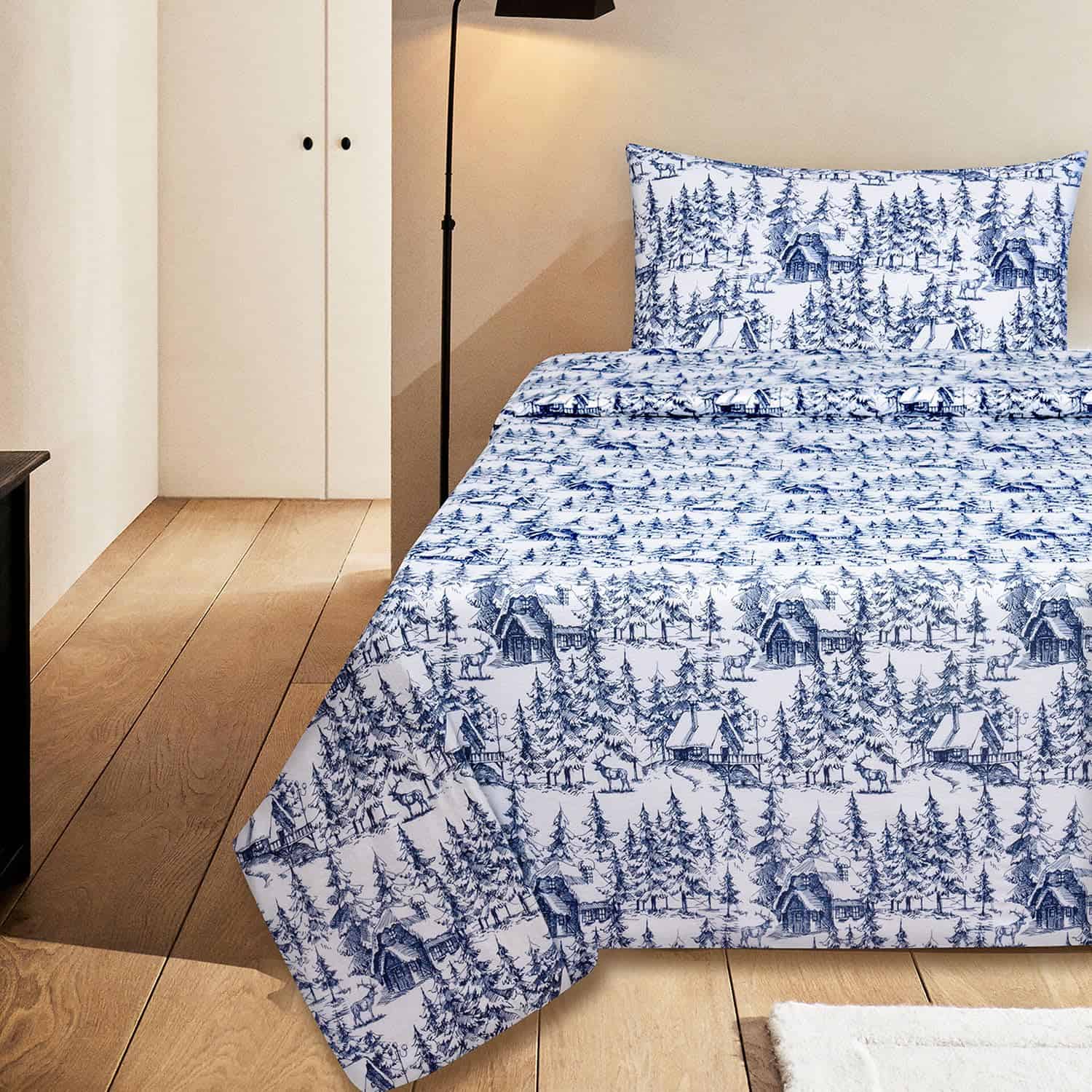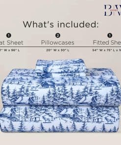 1. Azul Sylvania – El Juego de sábanas de franela estampadas Azul Sylvania, una deliciosa adición a la decoración de tu dormitorio. Este conjunto incluye cuatro piezas, cada una adornada con un cautivador escenario de bosque azul y blanco.