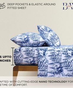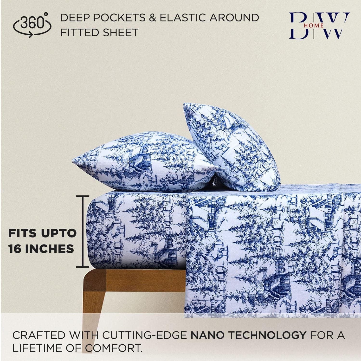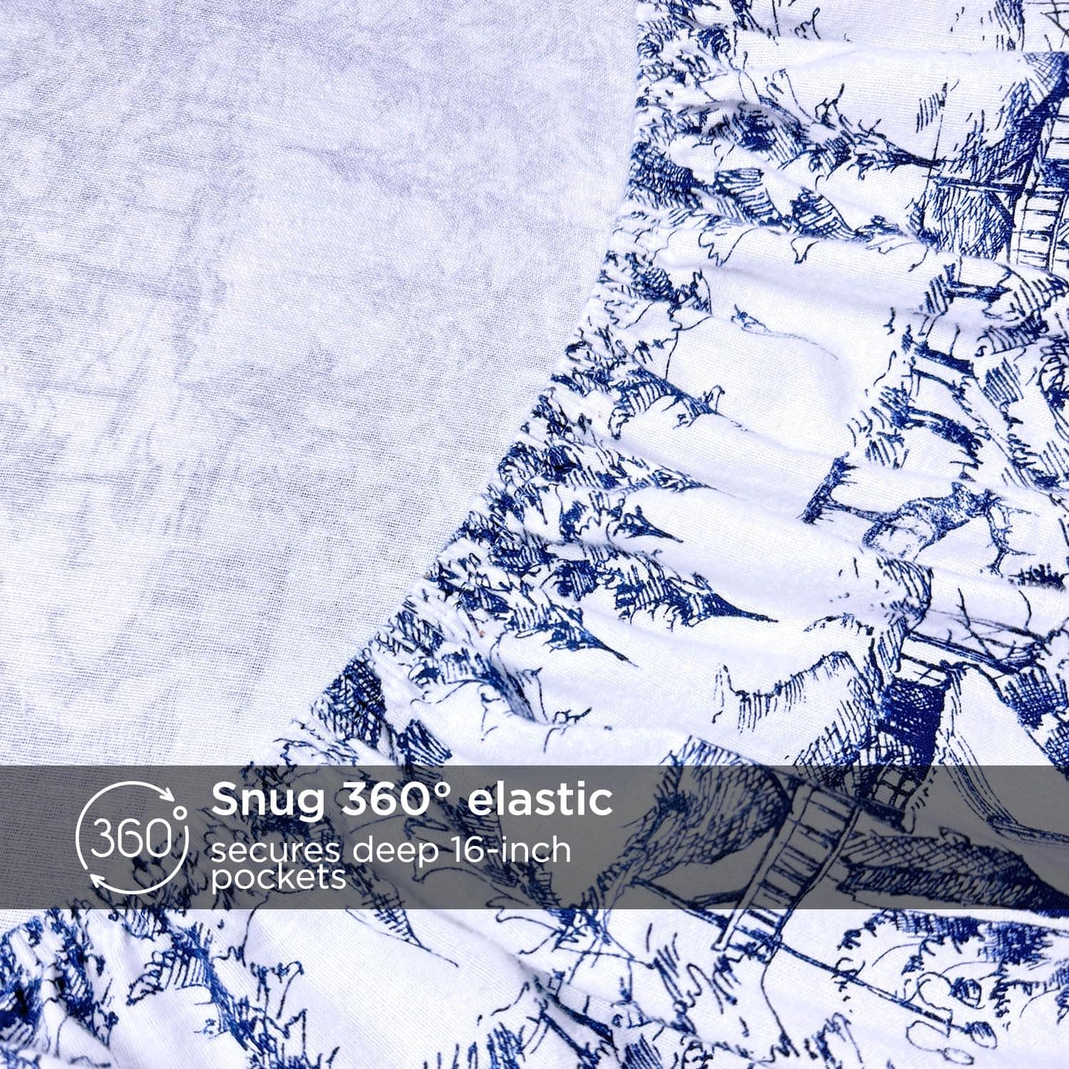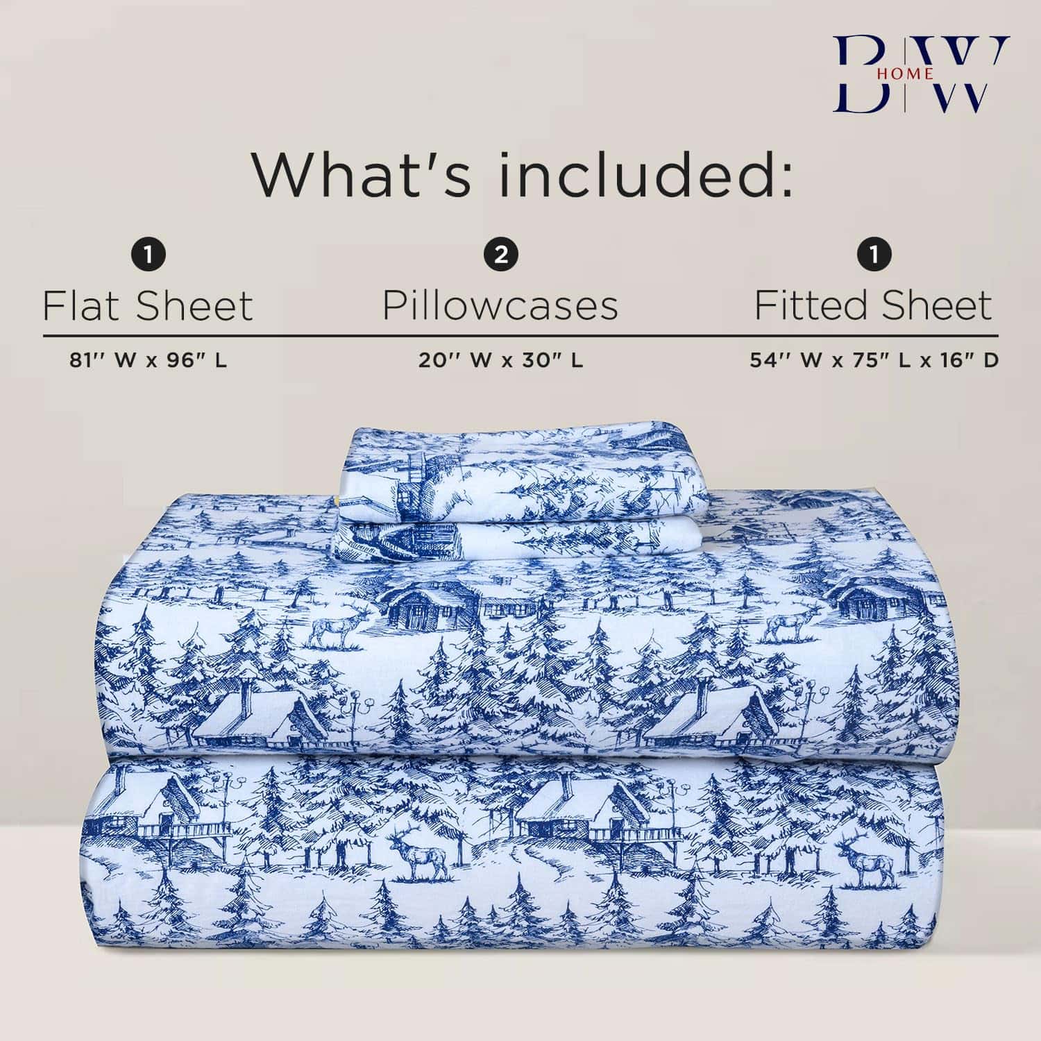 1. Azul Sylvania – El Juego de sábanas de franela estampadas Azul Sylvania, una deliciosa adición a la decoración de tu dormitorio. Este conjunto incluye cuatro piezas, cada una adornada con un cautivador escenario de bosque azul y blanco.