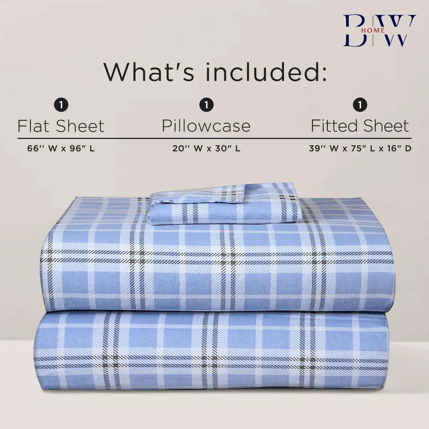 3. Tamaño – INDIVIDUAL Juego de Sábanas de 3 Piezas Incluye: Sábana Plana: 66″ W x 96″ L; Sábana Ajustable: 39″ W x 75″ L x 16″ D (para colchón de hasta 16″); Funda de Almohada: 20″ W x 30″ L, Sábana ajustable de bolsillo profundo con elástico alrededor (Se ajusta perfectamente hasta colchón de 16″).