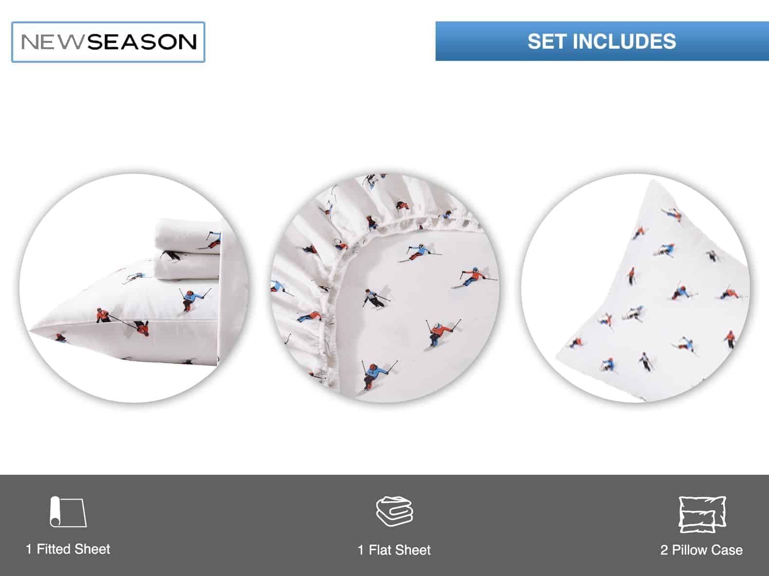1. Juego de sábanas de franela King de 4 piezas: una sábana ajustable King (78″ x 80″), una sábana King de franela (108″ x 102″), y 2 fundas de almohada tamaño estándar (20″ x 40″).