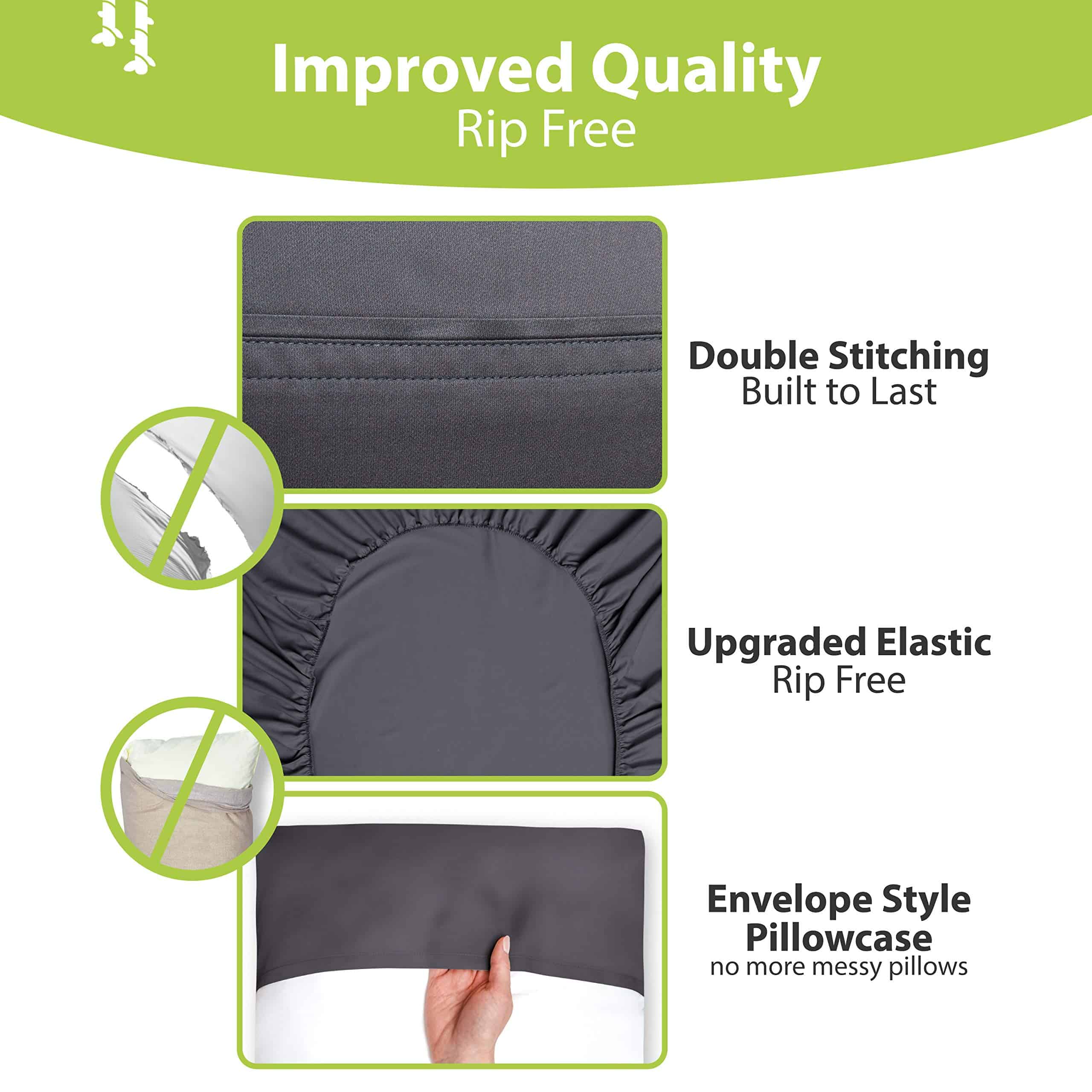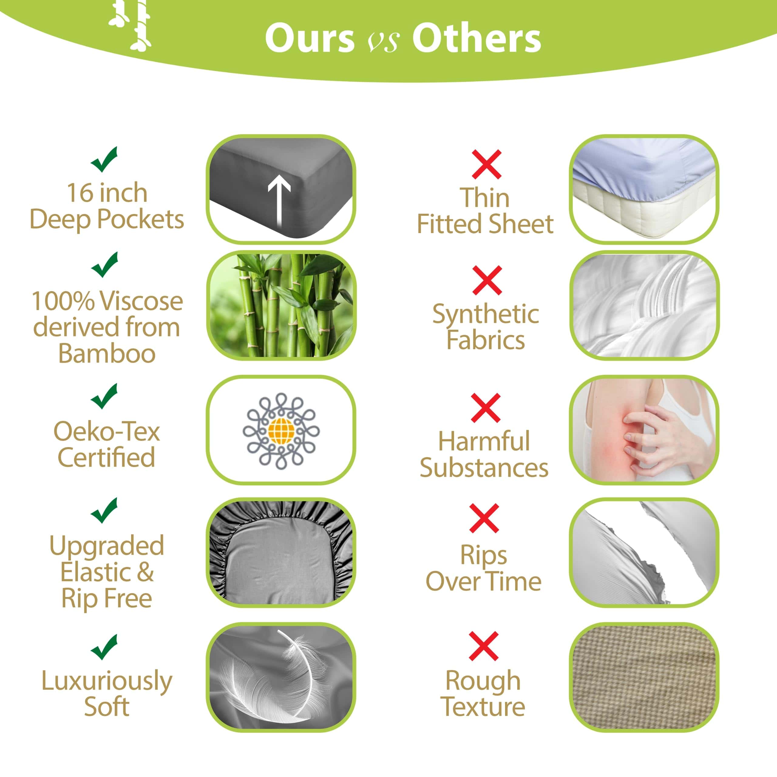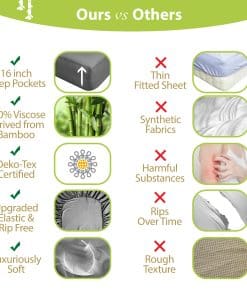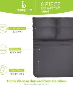 Experimenta el lujo puro de un juego de sábanas king de 100% viscosa derivada de bambú con el juego de sábanas de la serie de lujo BAMPURE. Este juego completo de 6 sábanas king incluye 1 sábana plana lujosamente suave (102″x105″), 1 sábana ajustada elástica completa (78″x80″) para un ajuste seguro en colchones de hasta 16 pulgadas de grosor, y 4 fundas de almohada con cierre de sobre (20″x40″) para mayor comodidad. Las sábanas de bambú viscosa ofrecen una comodidad de enfriamiento definitiva y una felicidad transpirable. Regulando la temperatura, estas sábanas mantenerte fresco y relajado durante toda la noche, perfecto para dormilones calurosos o aquellos con piel sensible. Las propiedades que absorben la humedad garantizan el confort durante todo el año, permitiéndote disfrutar de la suavidad lujosa con cada lavado. Tejidas en un lujoso tejido de satén, las sábanas de bambú viscosa ofrecen una sensación increíblemente suave y suave que se vuelve aún más suave con cada lavado. Nuestro juego de cama king cuenta con una sábana ajustable elástica completa con un bolsillo profundo (para colchones de hasta 16 pulgadas) para un ajuste seguro y que se mantenga en su lugar. Además, nuestras sábanas cuentan con la certificación estándar 100 de OEKO-TEX, lo que significa que están elaboradas y provenientes de fuentes responsables, libres de sustancias nocivas para un entorno de sueño saludable. Actualiza tu sueño esta noche con las sábanas de la serie de lujo BAMPURE.