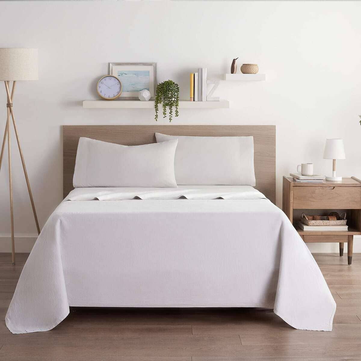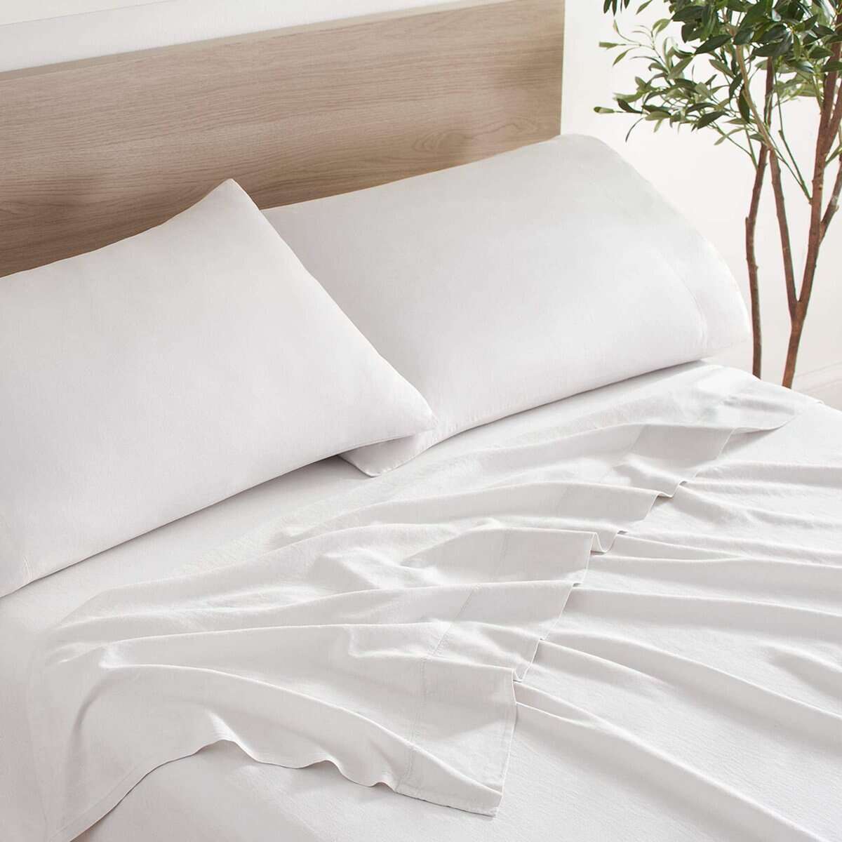 3. PALETA DE COLORES RELAJANTES: Elegimos una paleta de colores suaves y sutiles para nuestros juegos de sábanas de lino y eucalipto lyocell. Las sábanas de lino y lyocell están disponibles en crema latte, beige trigo, gris helado y blanco en polvo. Los juegos de sábanas de cuatro piezas están disponibles en tamaños California king, king, queen y full.