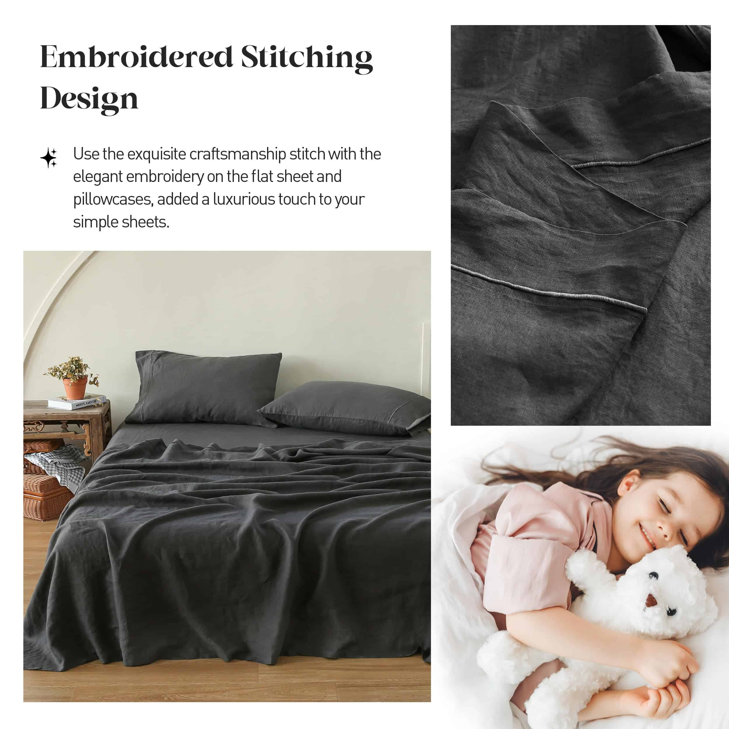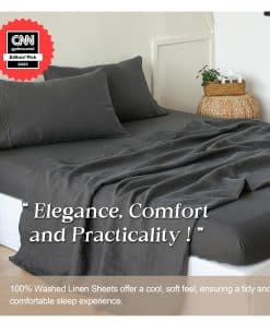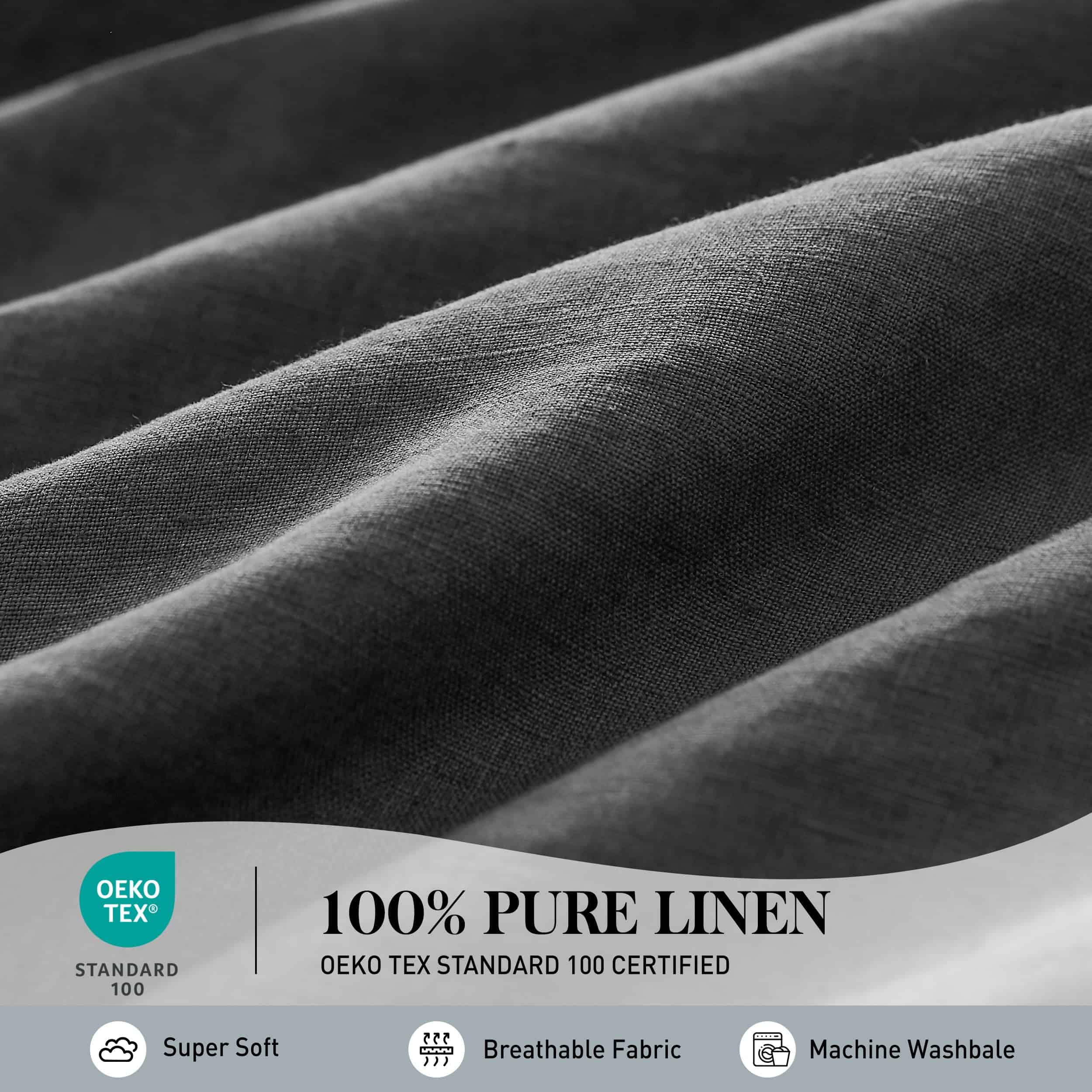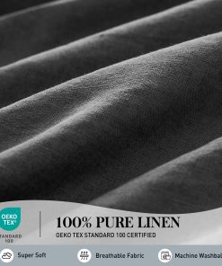 1. Material-100% Lino Puro lavado con piedra. El tejido suelto crea calor sin atrapar la humedad. El juego de sábanas de lino ha sido certificado por OEKO-TEX Standard 100.