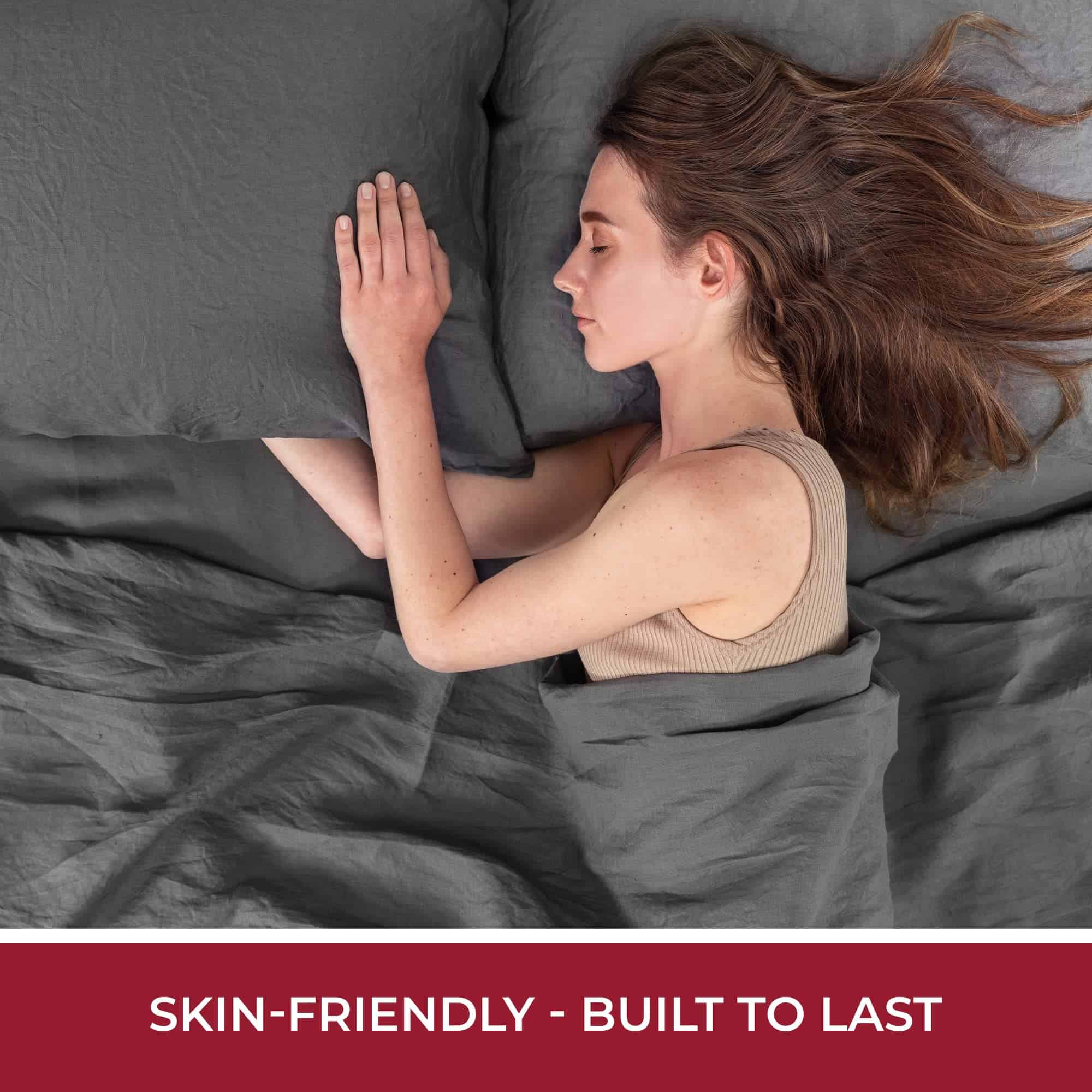 3. Textura rústica de lino característica – Proporciona un efecto de masaje ligero que no se encuentra en el algodón liso. Un 30% más duradero que el algodón, el flujo de aire mejorado del lino es ideal para pieles sensibles. La sensación texturizada distintiva se suaviza con cada lavado, a medida que la pectina que une las fibras se descompone suavemente. Disponible en elegantes tonos terrosos.