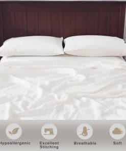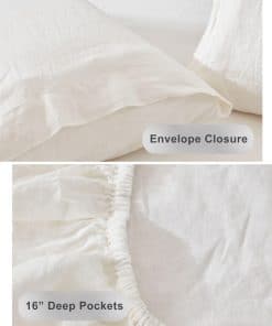 4. Lo que Recibes: El juego de sábanas de lino Tosmo en tamaño individual incluye, una sábana plana de 66″x96″, una sábana ajustable de 39″x75″, y una funda de almohada de 20″x30″. La sábana ajustable tiene un diseño de bolsillo profundo de 16.5″ con elástico de 360 grados alrededor, adecuado para la mayoría de los colchones.