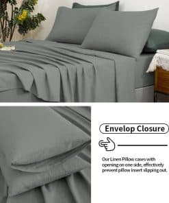 No es una sábana de mezcla de lino. Juego de sábanas de lino TUMEI tamaño Queen, Set de 4 piezas de sábanas de lino francés lavado al 100%, con sábana bajera ajustable de bolsillo profundo duradera y sábana plana y 5 fundas de almohada, Gris Morandi Queen