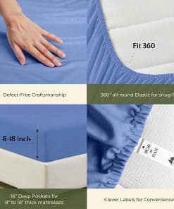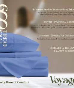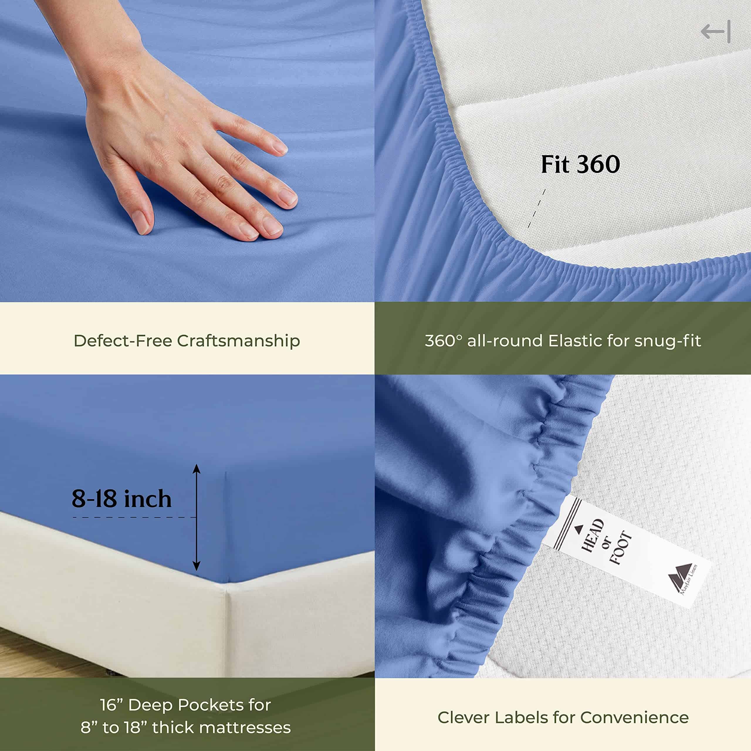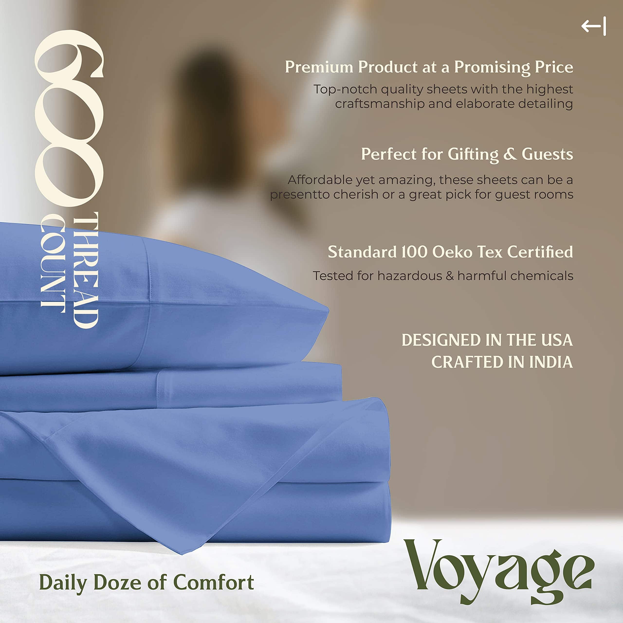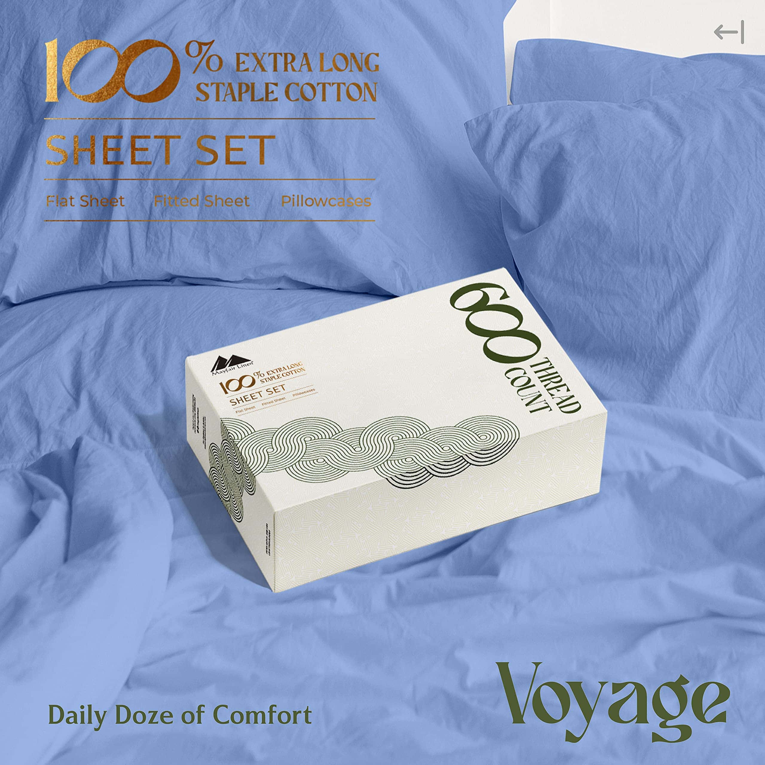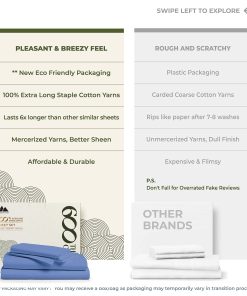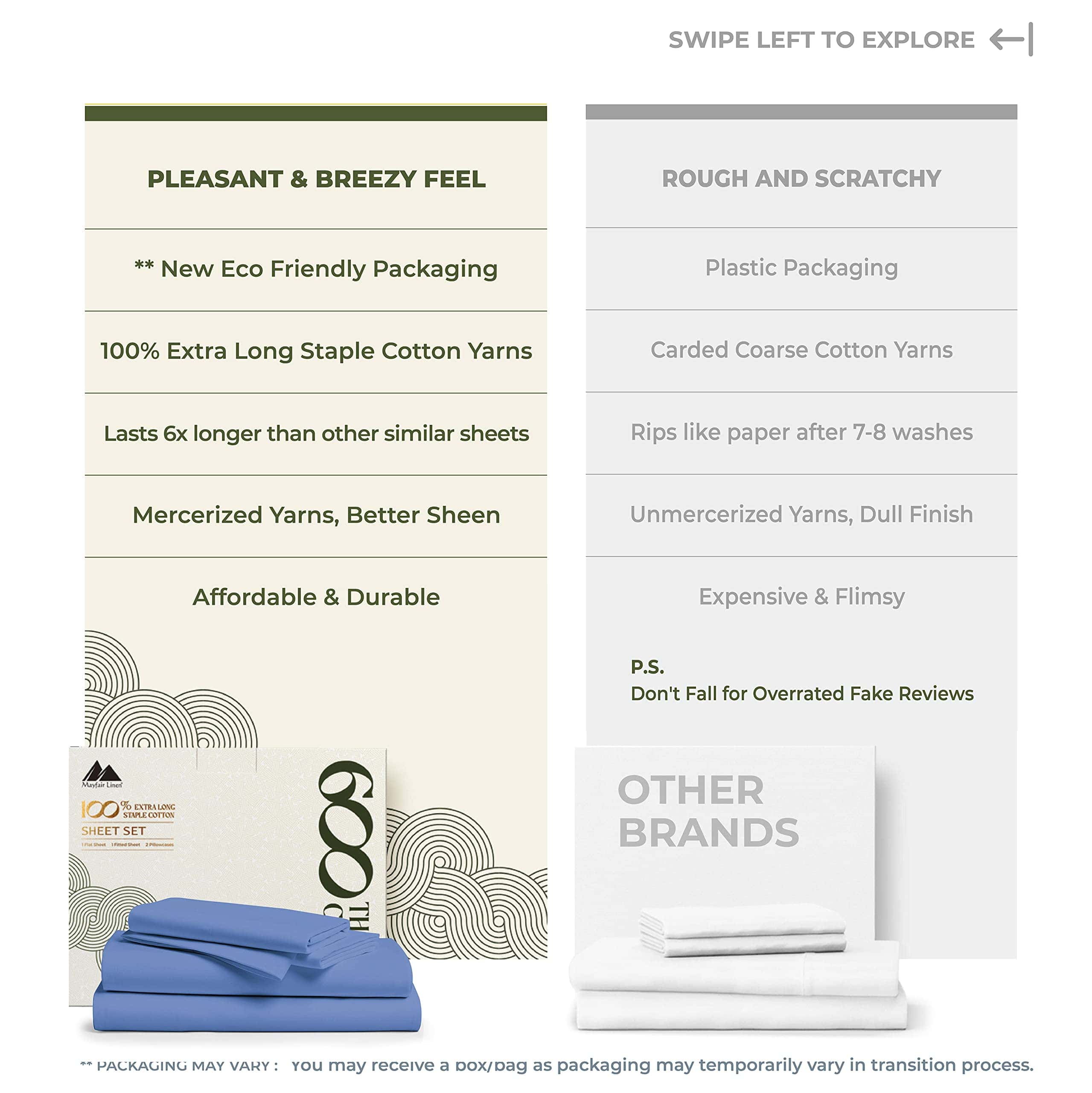 Nuestras sábanas Mayfair Linen de 600 hilos establecen nuevos estándares en comodidad. La alta densidad de 600 hilos por pulgada cuadrada garantiza un equilibrio entre suavidad y resistencia. Mercerizadas para un brillo mejorado y colores vivos, estas sábanas no solo son suaves, también son resistentes y diseñadas para sentirse lujosas en todas las estaciones. Nuestras sábanas son meticulosamente confeccionadas para adaptarse a colchones de bolsillo profundo de hasta 18 pulgadas. Un elástico alrededor garantiza un ajuste ceñido que se mantiene en su lugar toda la noche. Este juego incluye una sábana plana que mide 102» de ancho x 108» de largo, una sábana ajustable de 78» de ancho x 80» de largo + 16 pulgadas de bolsillo profundo, y dos fundas de almohada tamaño King cada una de 21» de ancho x 40» de largo. Nuestras sábanas son mercerizadas para aumentar su resistencia, solidez del color y resistencia al apelmasamiento. Disfruta de ropa de cama que permanece vibrante y suave lavado tras lavado, sin preocuparte por la decoloración, encogimiento o apelmasamiento. Cada hilo de nuestras sábanas se obtiene cuidadosamente, utilizando algodón cosechado sin sustancias nocivas. Con una certificación STANDARD 100 de OEKO-TEX, nuestra ropa de cama cumple con rigurosos estándares de seguridad. Embalamos nuestros productos en materiales completamente libres de plástico, garantizando que cada elemento se fabrique con un cuidado y responsabilidad extremos. Imagina la comodidad lujosa y sedosa de una cama de hotel de cinco estrellas. Con un tejido satinado, nuestras sábanas ofrecen ese toque suntuoso, fresco y suave, haciendo que cada noche se sienta como una escapada de lujo. Los cierres abiertos en nuestras fundas de almohada hacen que sean fáciles de manejar, asegurando que las almohadas se deslicen suavemente y permanezcan cómodamente en su lugar toda la noche. Nuestra dedicación a la calidad asegura que cada juego de sábanas cumpla con los rigurosos estándares esperados en los mejores hoteles.