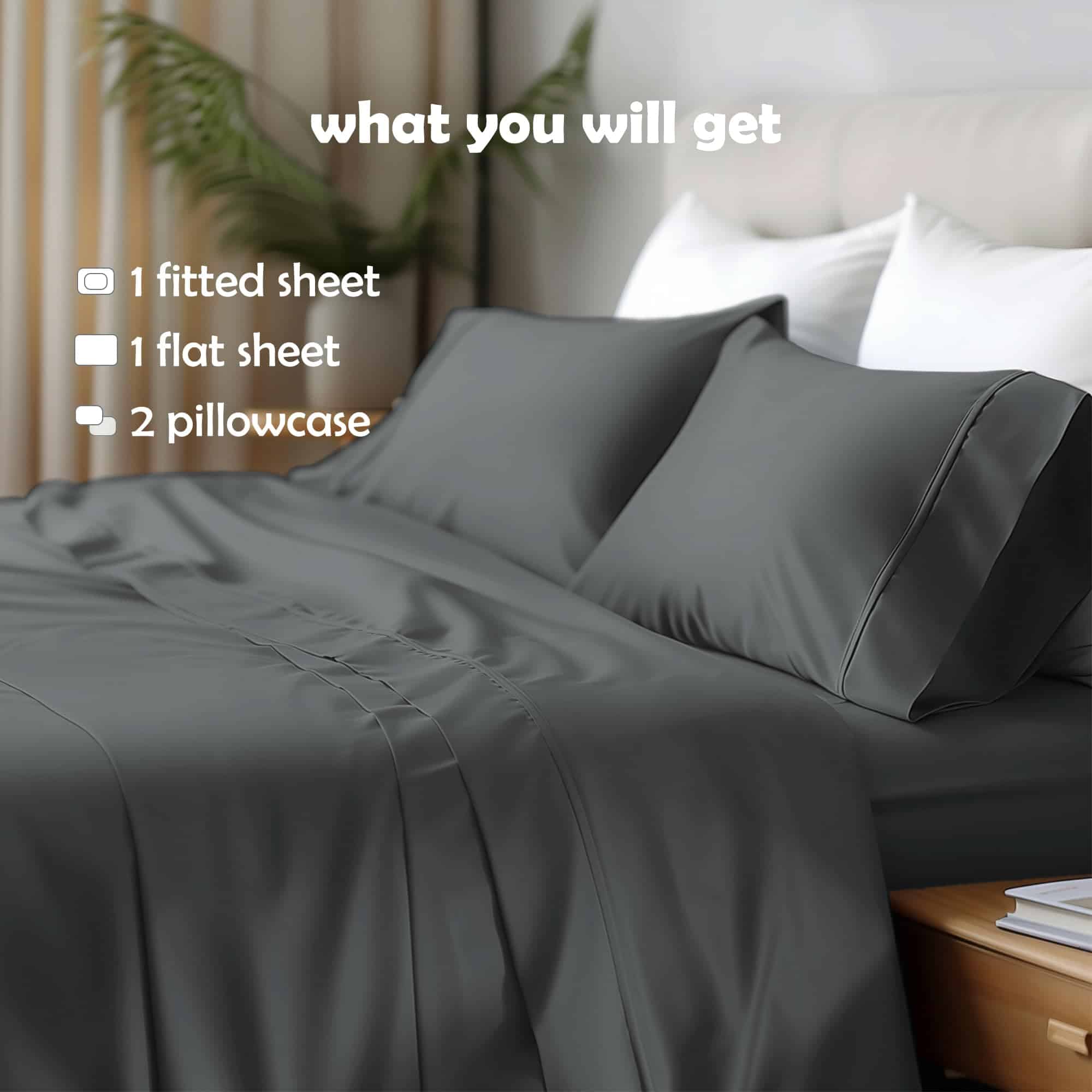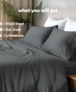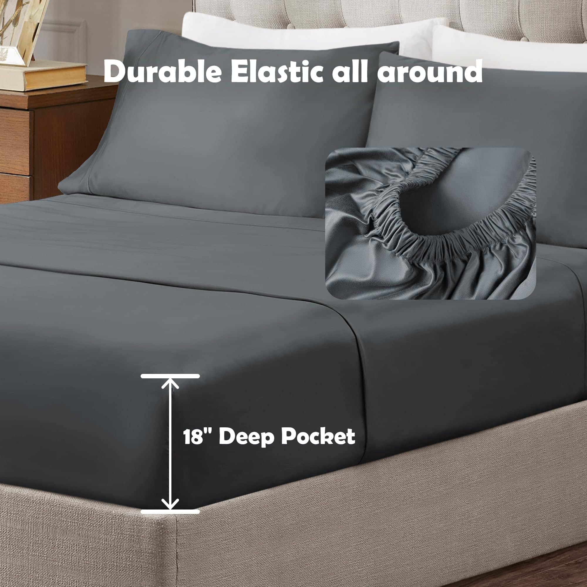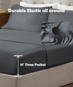 3. Bolsillo profundo de 18 pulgadas en la sábana ajustable, adecuado para colchones de hasta 18 pulgadas de profundidad. Bandas elásticas profesionalmente personalizadas abrazan de forma segura las esquinas de la cama, evitando deslizamientos o desplazamientos. Diseñado para un ajuste ajustado y cómodo. El juego incluye una sábana ajustable, una sábana plana y dos fundas de almohada. Disponible en tamaños Queen, King y Cal King.