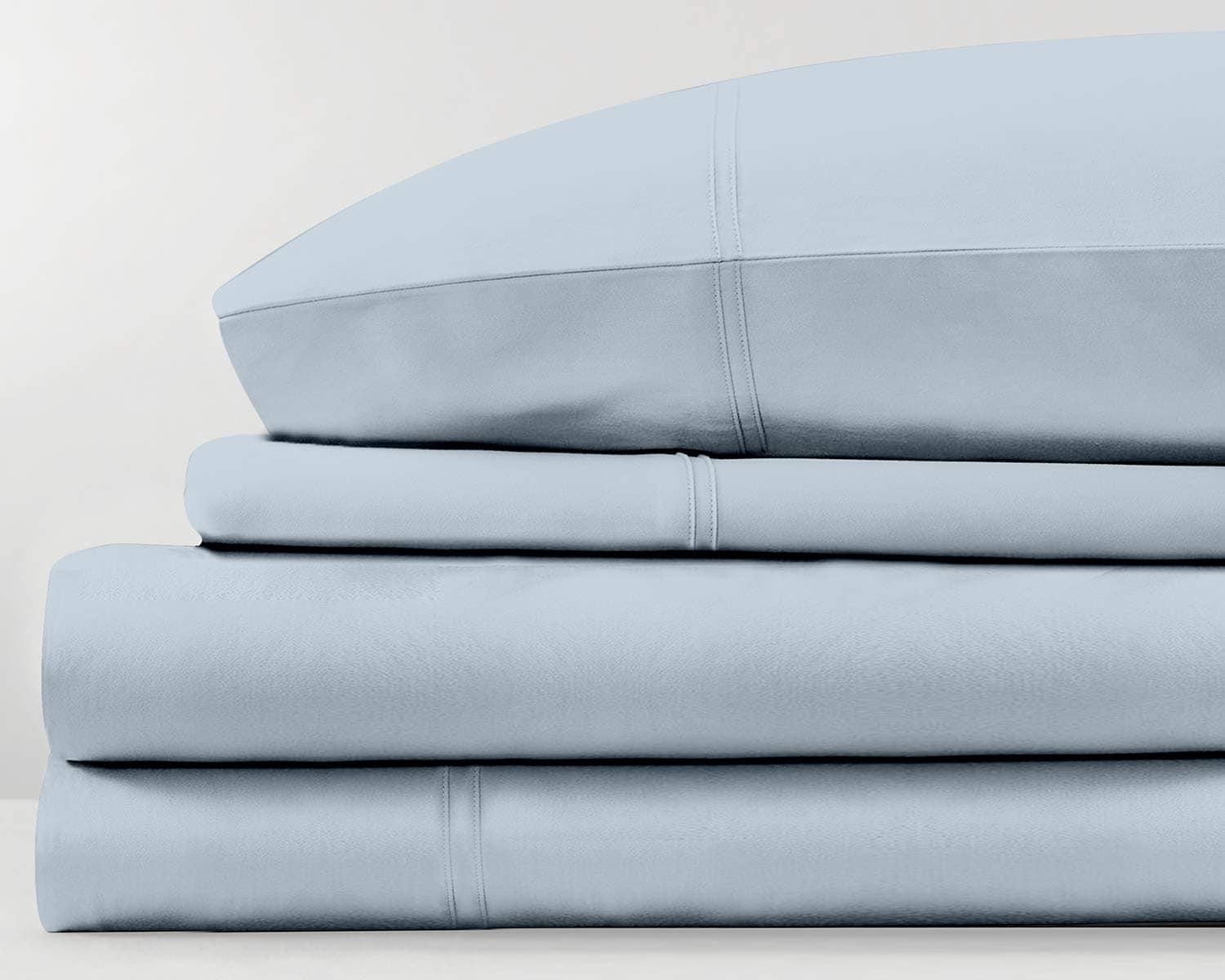 Juego de sábanas de alta calidad Royal Hotel Bedding de 1000 Hilos en tamaño Cal King. Estas sábanas de algodón están hechas con un tejido satinado de alta calidad que proporciona una textura rica y pesada para su máxima comodidad. Con un diseño sólido en azul claro que complementará cualquier decoración de dormitorio. Este juego de sábanas incluye una sábana plana de 102″ x 108″, una sábana ajustable de 72″ x 84″ y dos fundas de almohada King de 20″ x 40″. Las sábanas son aptas para colchones de hasta 22 pulgadas de profundidad y cuentan con elástico en toda la sábana ajustable para un ajuste seguro. Fabricadas con algodón 100% de fibra larga peinado de alta calidad para una sensación de lujo a un costo asequible. Fáciles de cuidar, lavables a máquina en agua fría con detergente suave y secar a baja temperatura. No blanquear. La satisfacción del cliente es nuestra prioridad, por lo que ofrecemos devoluciones y reembolsos fáciles. Cada juego de sábanas viene en un empaque transparente con cierre con etiquetado completo del producto para su conveniencia.