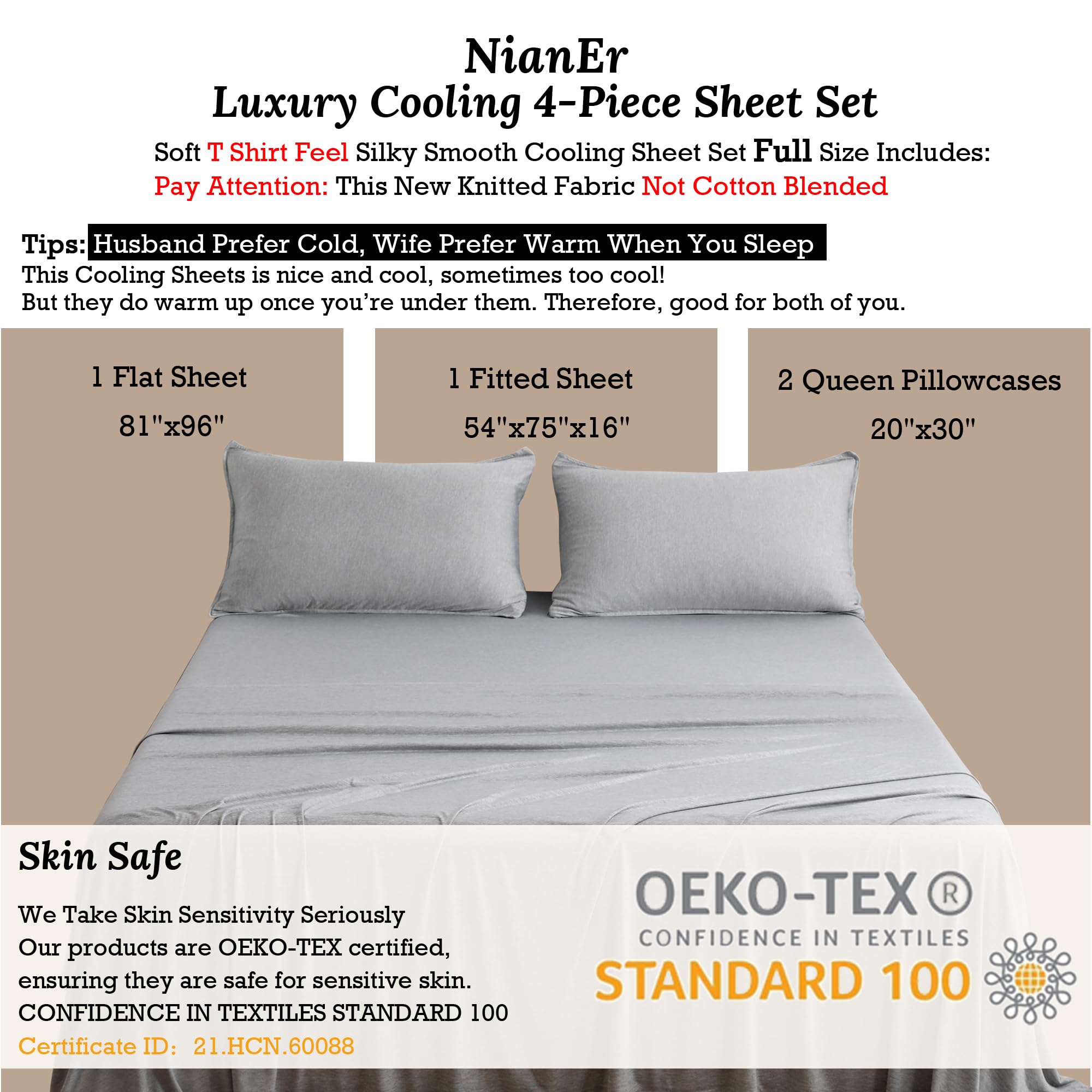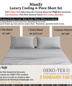 3. Por qué elegir las sábanas frías NianEr: una artesanía de primera clase: esta tela es resistente a las arrugas, no se encoge, no se rasga, no se decolora y no se apelota. Por cierto, nuestros juegos de sábanas frías están certificados por OEKO-TEX STANDARD 100 y el ID del certificado es 21.HCN.60088, por lo que son hipoalergénicos y seguros para la piel sensible. Además, sin etiquetas en la sábana plana: etiqueta solo en la sábana ajustable de 16″ y las fundas de almohada. Tamaño completo incluye una sábana plana de 81″x96″, una sábana ajustable de 54″x75″x16″, dos fundas de almohada con cremallera de 20″x30″.