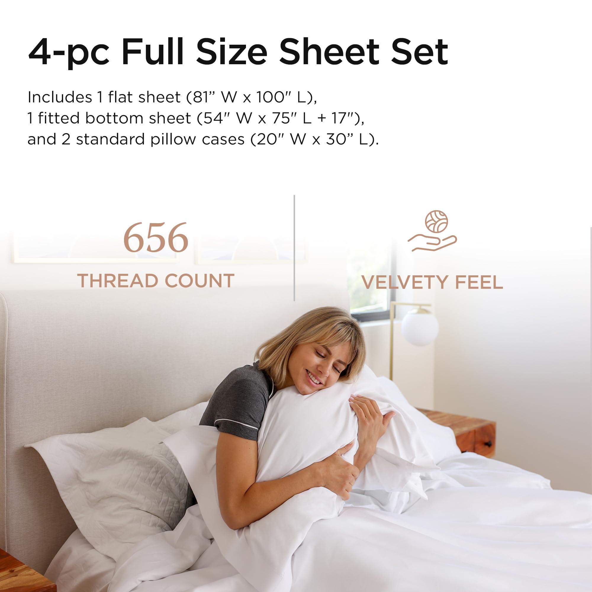 Threadmill Luxury Full Size Sheets | 656 Thread Count Certified Supima Cotton Sheets for Full Size Mattress | 5-Star Hotel Quality 4 Piece Bed Sheets with Extra Deep Pocket | White Sheets
