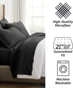 5. UN JUEGO DE SÁBANAS COMPLETO PARA CAMA QUEEN: Este juego de sábanas queen de bolsillos extra profundos de 21 pulgadas incluye 1 sábana ajustable queen (60″ x 80″), 1 sábana plana extragrande (90″ x 102″) y 4 fundas de almohada queen (20″ x 30″), para una actualización cohesiva del juego de sábanas negras queen.