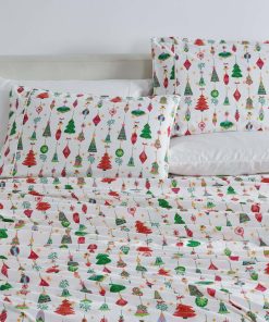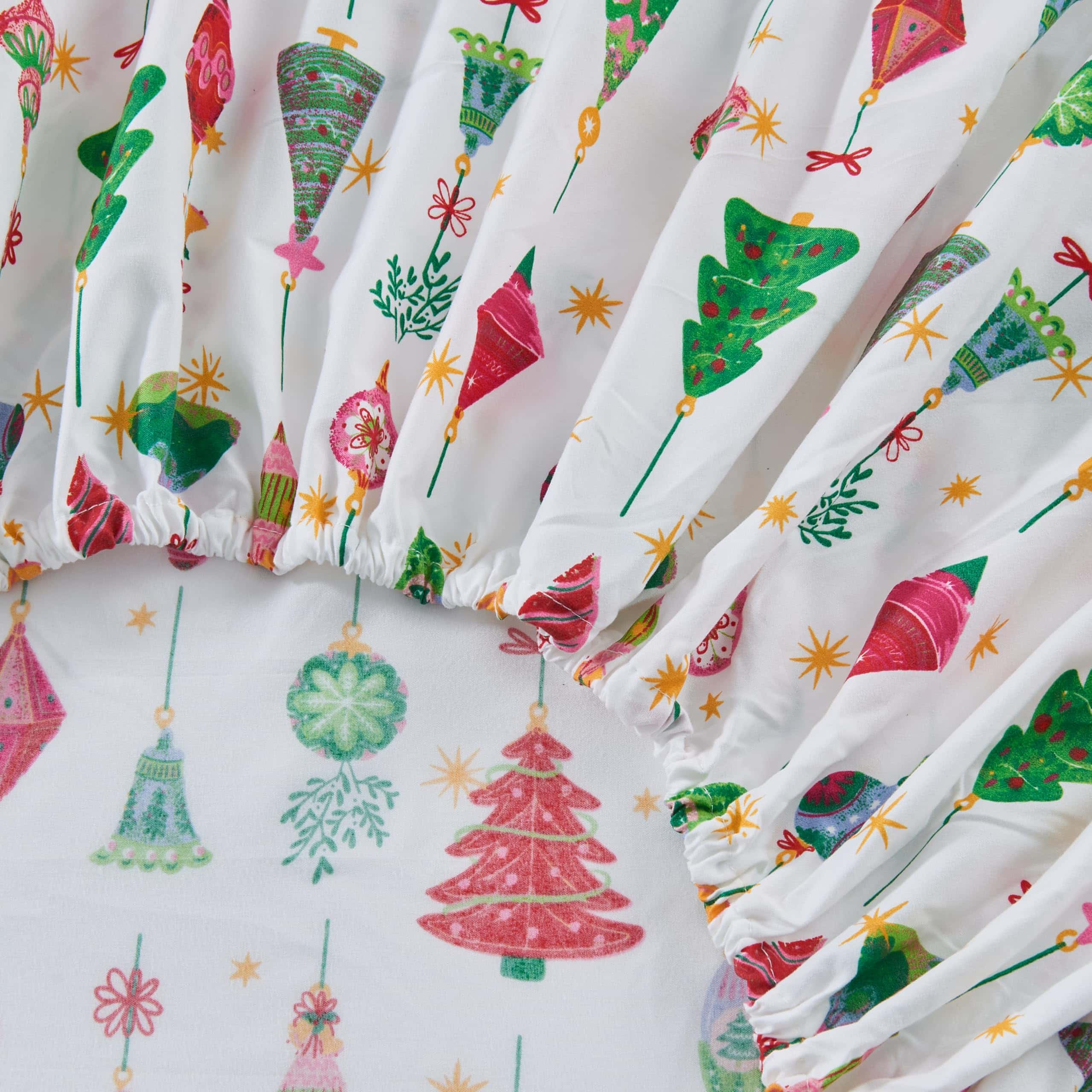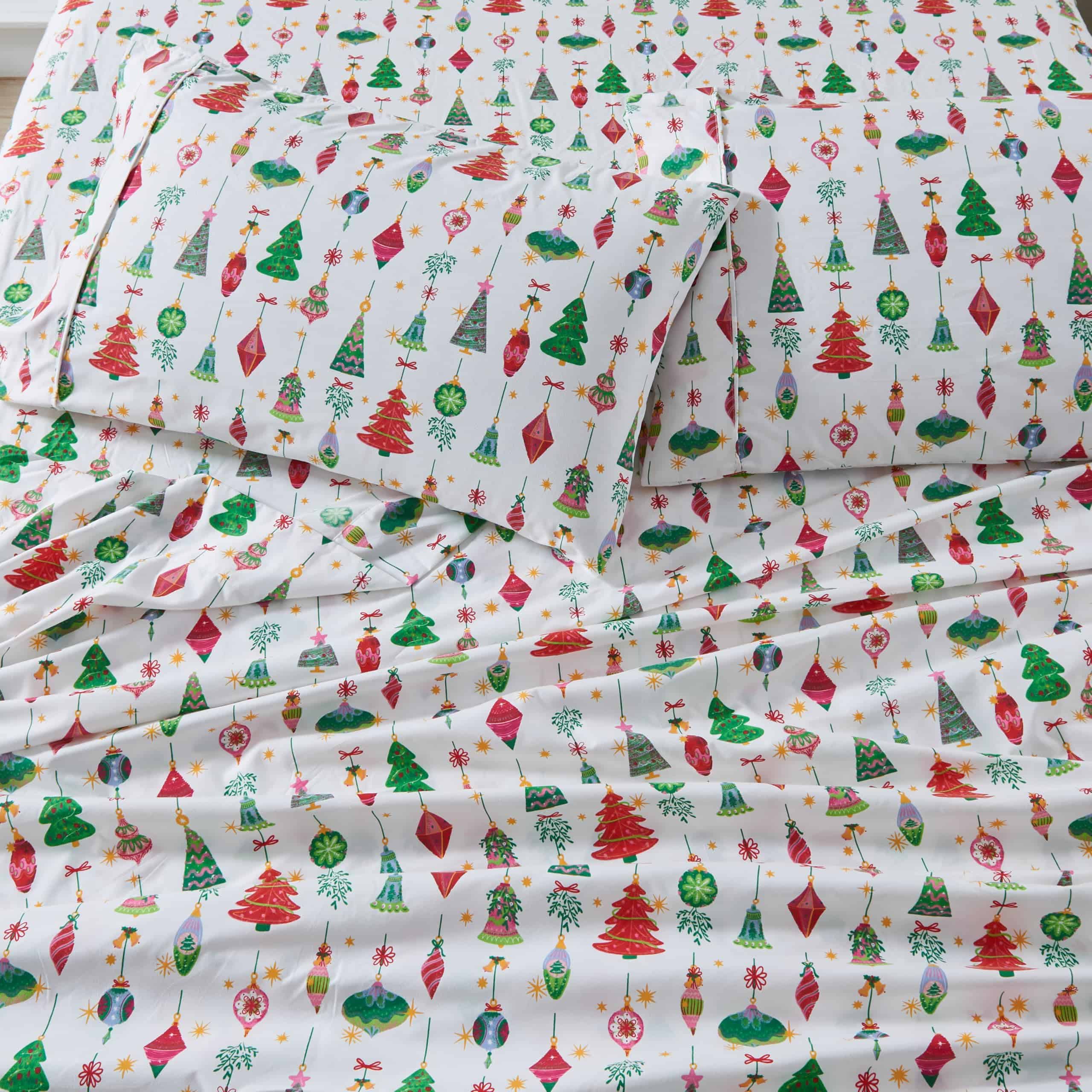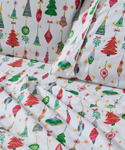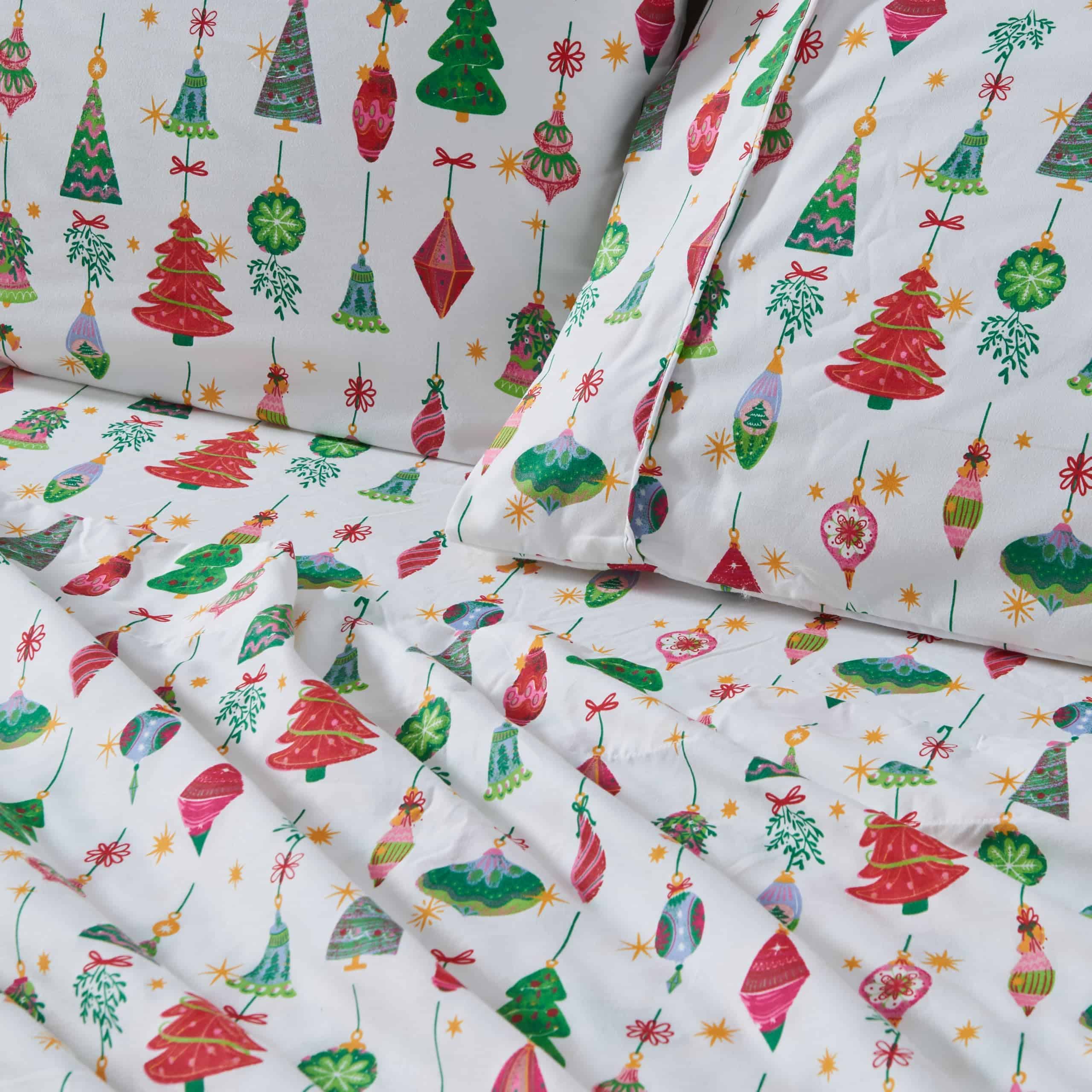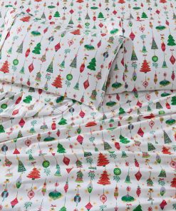 1. Diseño Festivo de las Fiestas: Decora tu dormitorio con la alegría de nuestros juegos de sábanas con estampado de adornos en clásico rojo y verde – ¡perfecto para agregar un toque de magia navideña a tu decoración!.