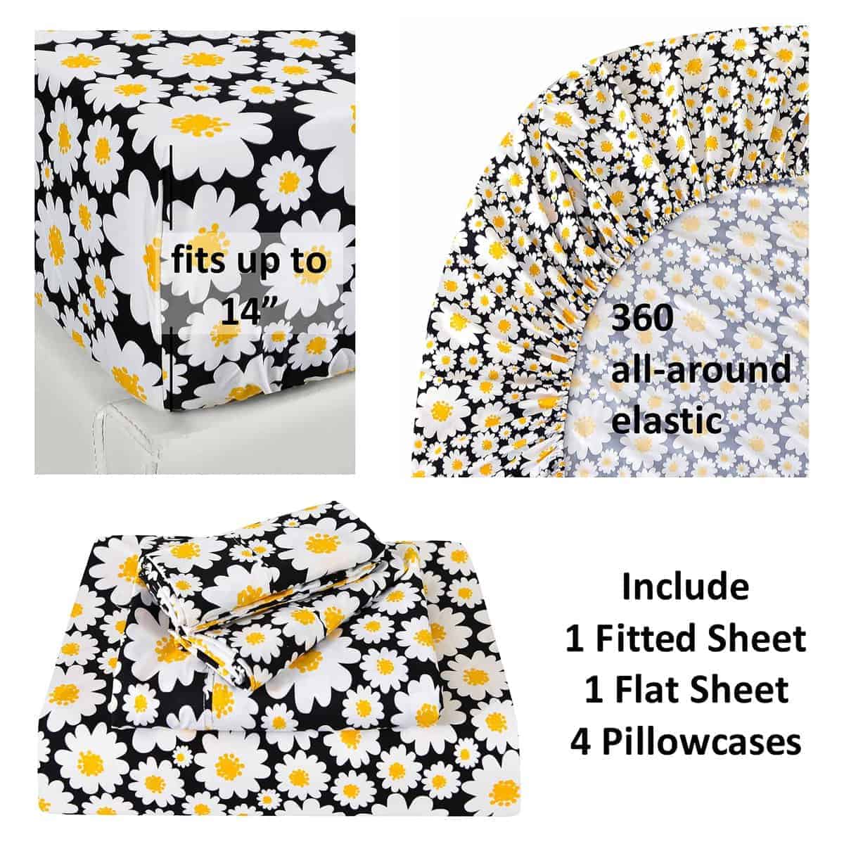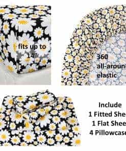 2. ELÁSTICOS DE 360 ALREDEDOR: La sábana ajustable está completamente elástica y se adapta a colchones de hasta 14 pulgadas de profundidad, cualquier bolsillo de colchón más pequeño que 14 pulgadas estará bien y se mantendrá en buena forma, el juego de sábanas tamaño Queen incluye 1 sábana ajustable 60″x80″, 1 sábana plana 90″x101″, 4 fundas de almohada con cierre de sobre 20″x30″.
