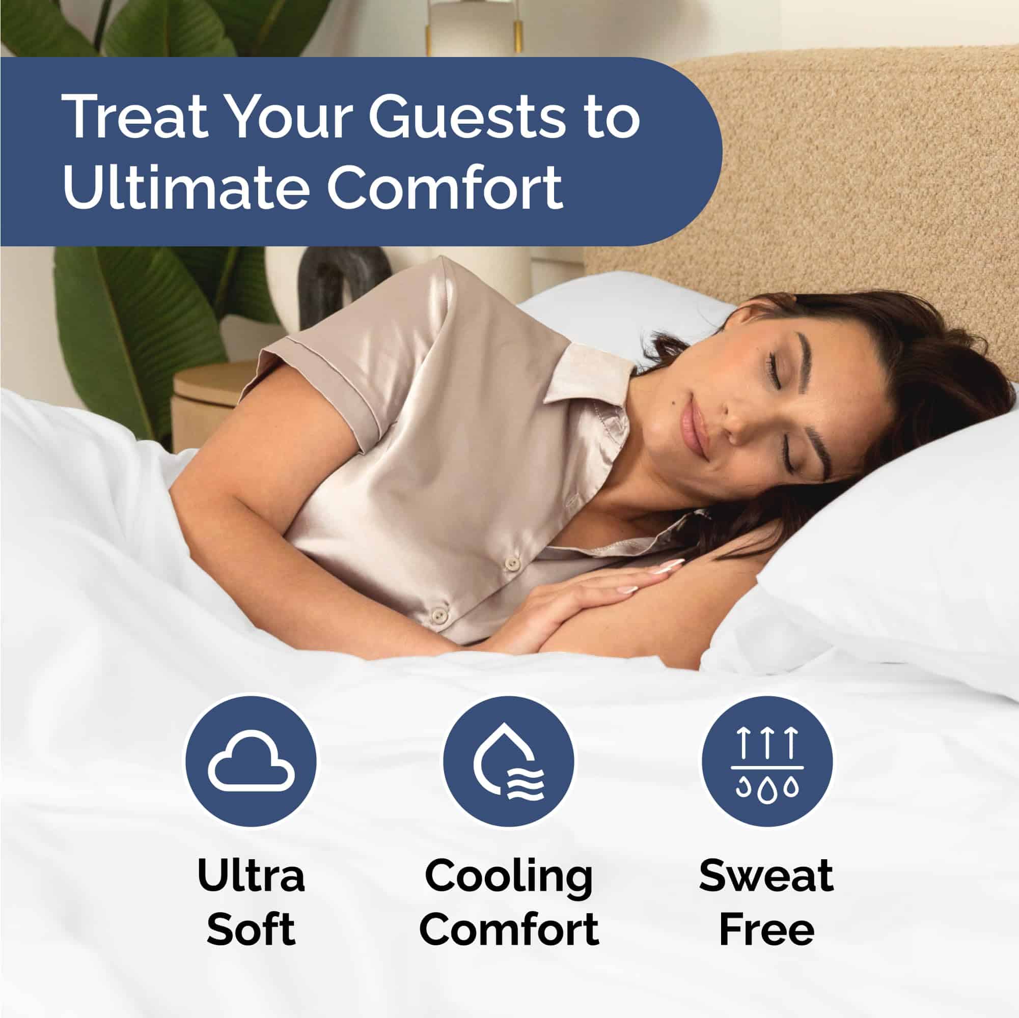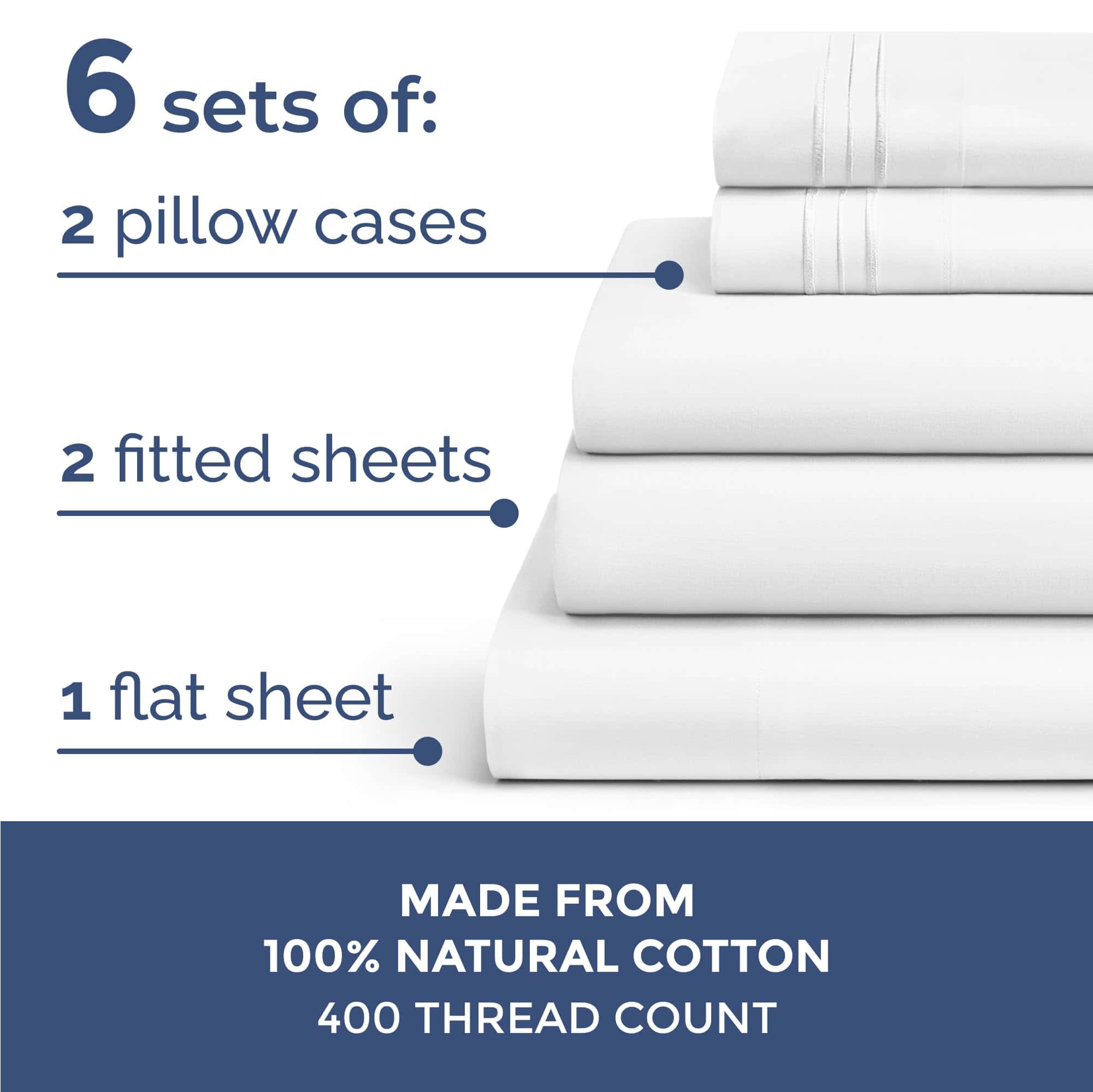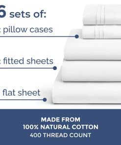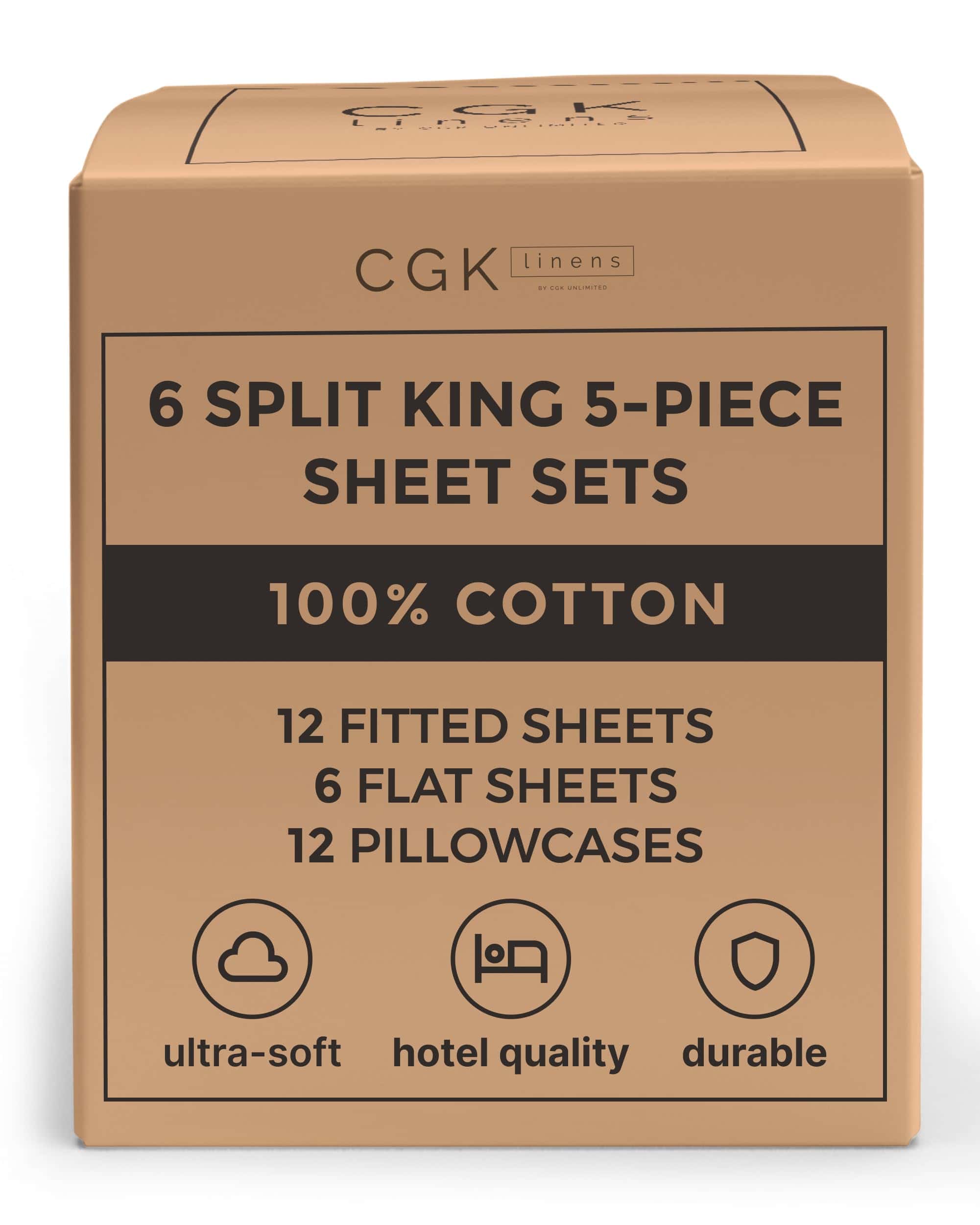 Juego de 6 sábanas a granel tamaño Split King de CGK LINENS. Nuestras sábanas son maravillosamente ligeras, suaves, transpirables, que absorben la humedad y de alta calidad. Juegos de sábanas a granel duraderos y suaves como la seda, perfectos para spas, camillas de masaje, hoteles, Air Bnbs, instalaciones médicas y más. Sábanas reguladoras de temperatura. Las cualidades reguladoras de la temperatura de estas sábanas de algodón las convierten en la elección perfecta para mantenerse fresco en verano y cálido en invierno. El juego de sábanas de algodón al mayor de CGK Linens Incluye: 6 Sábanas Planas (108″ x 102″) 6 Sábanas Ajustables (39″ x 80″) 12 Fundas de Almohada (20″ x 40″) CARACTERÍSTICAS: Bolsillos Profundos para Adaptarse a Colchones de 16″ de Profundidad. Suave, ligeramente crujiente, refrescante. Regulador de temperatura, 400 hilos. Fácil cuidado, lavable a máquina. Calidad de lujo a un precio asequible. Tenemos altos estándares para nuestros juegos de sábanas de algodón y trabajamos arduamente para mantener esos estándares y mantenerte feliz y bien descansado. ¡Nuestros juegos de sábanas a granel de calidad hotelera te dejarán dormir profundamente!