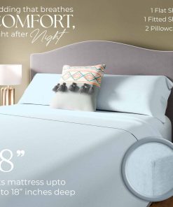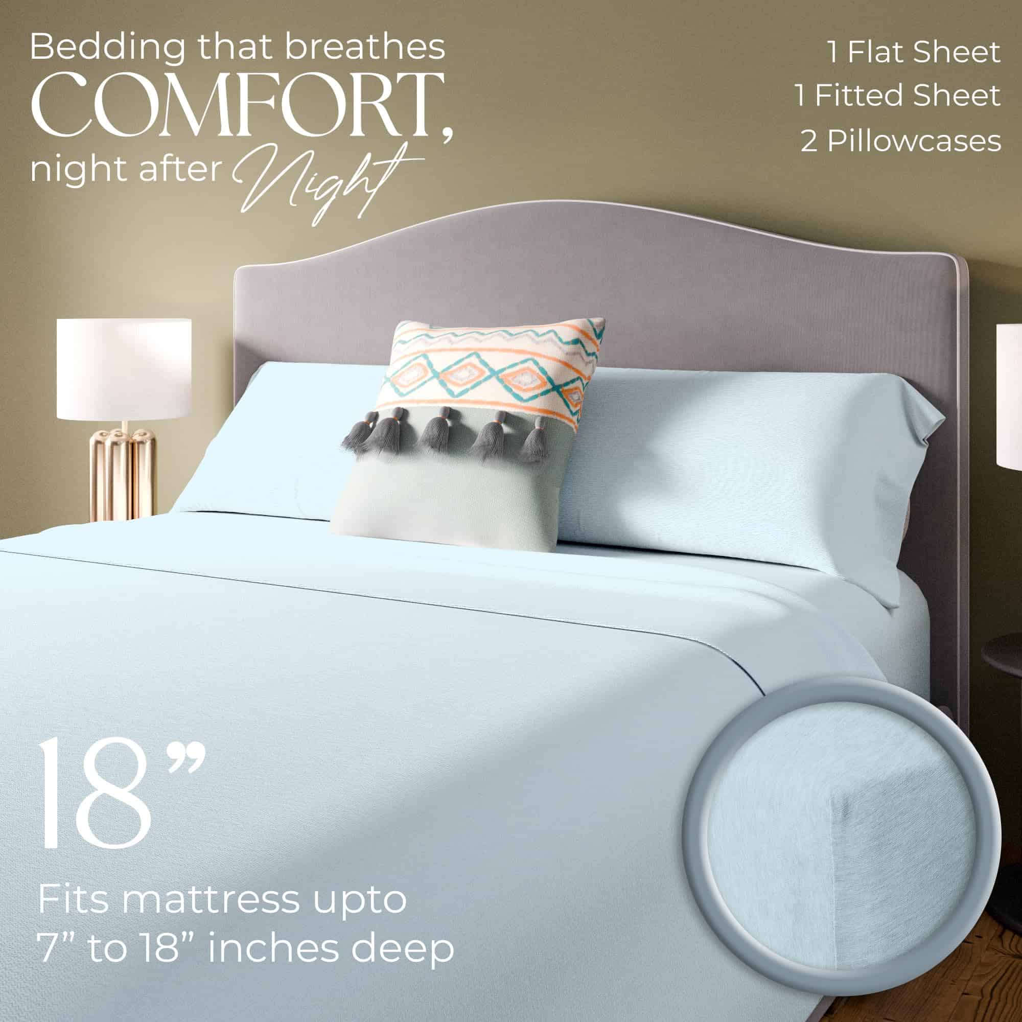 1. Siente la Diferencia de un Tejido de Punto: Tejidas con un tejido clásico de percal, nuestras sábanas y fundas de almohada se sienten más suaves y acogedoras que las sábanas tejidas, mejorando la comodidad general para una experiencia de dormir en nubes todas las noches. Además, están tejidas con una estructura de unión para una durabilidad excepcional. 2. Tu Compañero Todo el Año: Nuestras sábanas y fundas de almohada de punto jersey están diseñadas para ser frescas al tacto, asegurando que te mantengas cómodamente fresco en días soleados mientras te mantienes agradablemente cálido en días invernales. 3. Ajuste Perfecto para tu Colchón: Nuestra sábana ajustable de tamaño Queen está completamente elasticada para adaptarse a colchones de hasta 14 pulgadas, permitiendo un ensamblaje ajustado incluso con diferentes profundidades de colchones. También cuenta con una «Etiqueta Inteligente de Cabeza/Pies» para indicar a qué lado pertenece para facilitar su uso. 4. ¿Qué incluye el Set?: Nuestro juego de sábanas tamaño queen incluye 1 sábana plana (90 pulgadas de ancho x 102 pulgadas de largo), 1 sábana ajustable (60 pulgadas de ancho x 80 pulgadas de largo) y 2 fundas de almohada estándar (20 pulgadas de ancho x 30 pulgadas de largo) para adaptarse mejor a tus necesidades. 5. Instrucciones de Cuidado al Lavar: Nuestra ropa de cama, tejida con un tejido de percal, es conocida por su notable durabilidad y comodidad excepcional. Es conveniente lavar a máquina, manteniendo su color y volviéndose más suave con cada lavado. Sin embargo, para evitar arrugas, retira rápidamente las sábanas y fundas de almohada de la secadora o plánchalas. Ropa de cama de fácil cuidado para estilos de vida ocupados.