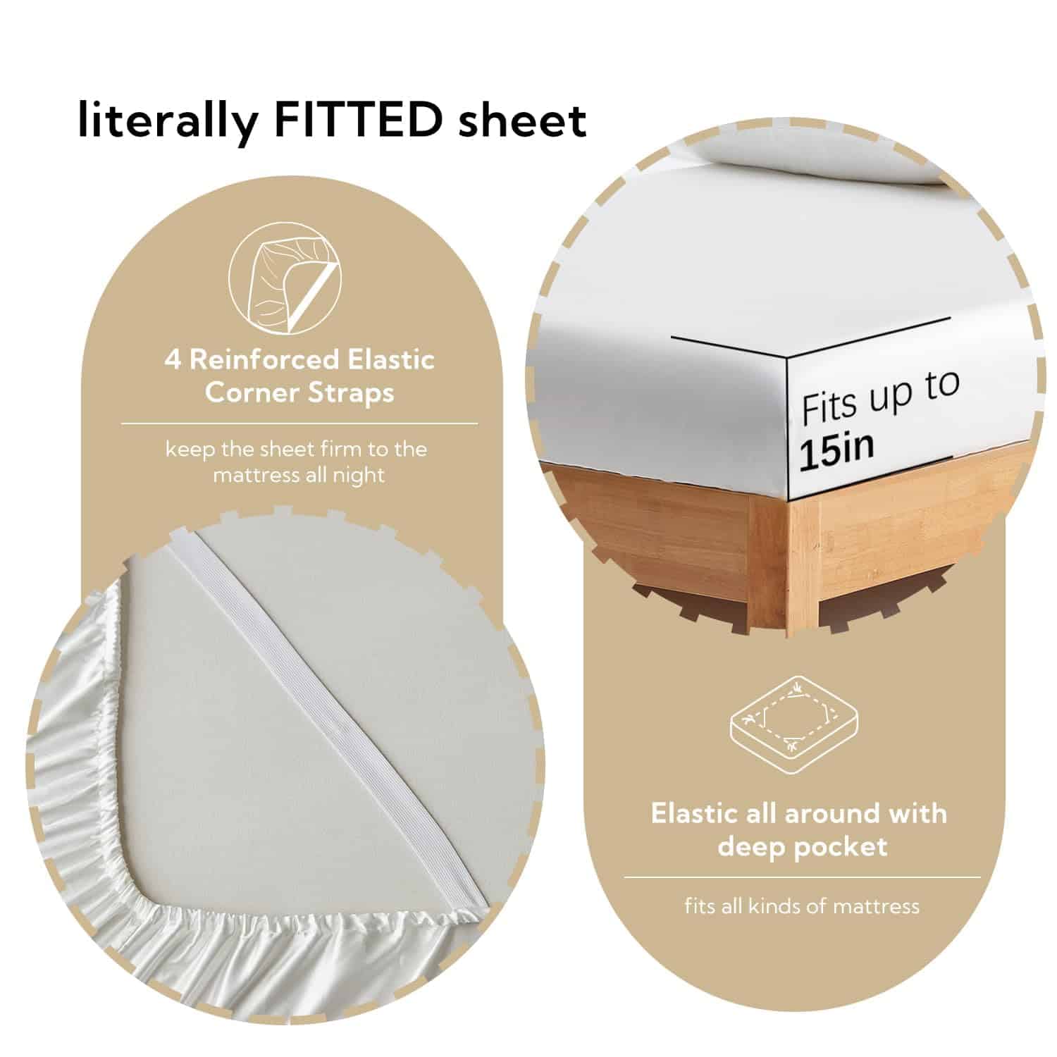 1. Juego de sábanas de tamaño completo 1 Sábana plana: 81″x 96″, 1 Sábana bajera ajustable: 54″x 75″ + 15″ de bolsillo profundo, 4 Fundas de almohada: 20″x 30″. 2. Experiencia de sueño sedoso y suave Elaboradas con 100% poliéster de satén, nuestras sábanas son lujosas y suaves al tacto. Experimenta la máxima comodidad sin fricción ni restricción. La tela transpirable mantiene tu piel fresca, ofreciendo una sensación similar a dormir en las nubes.