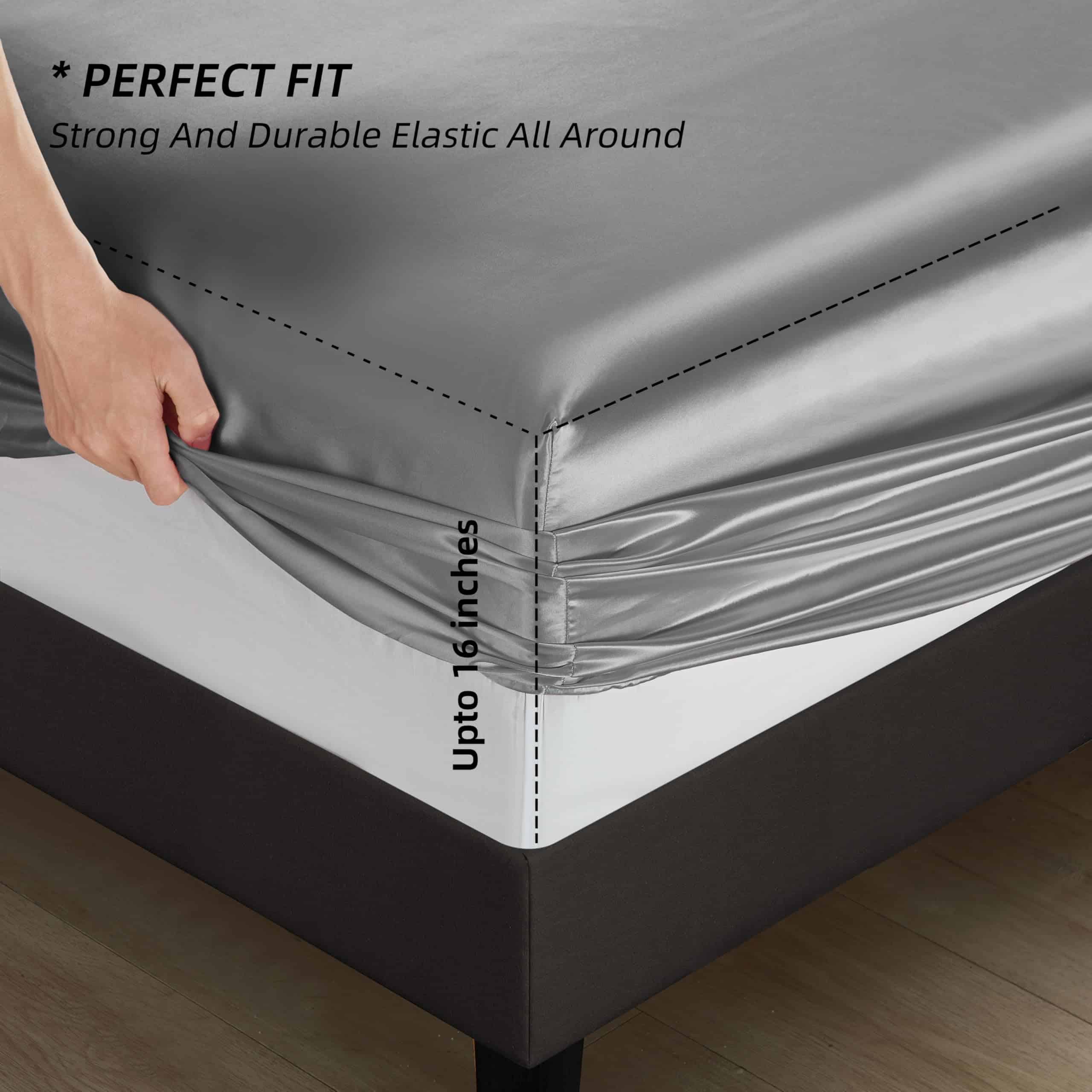 Sábana de Satén Queen: 1 Sábana Plana: 90″ x 102″; 1 Sábana Ajustable: 60″ x 80″ ; 2 Fundas de Almohada: 20″ x 30″;1 Funda de Almohada para Cuerpo 20″ x 54″