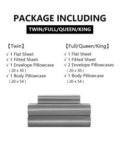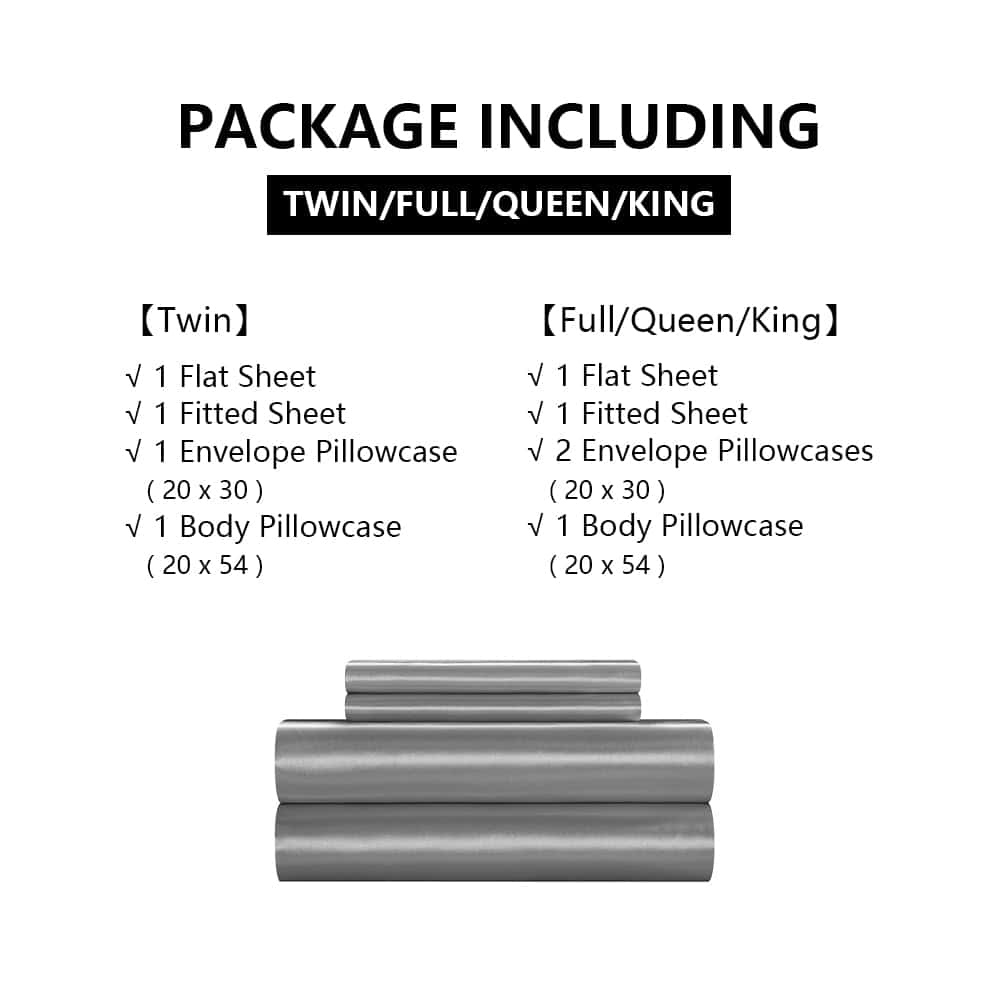 Sábana de Satén Twin: 1 Sábana Plana: 66″ x 96″; 1 Sábana Ajustable: 39″ x 75″ ; 2 Fundas de Almohada: 20″ x 30″;1 Funda de Almohada para Cuerpo 20″ x 54″