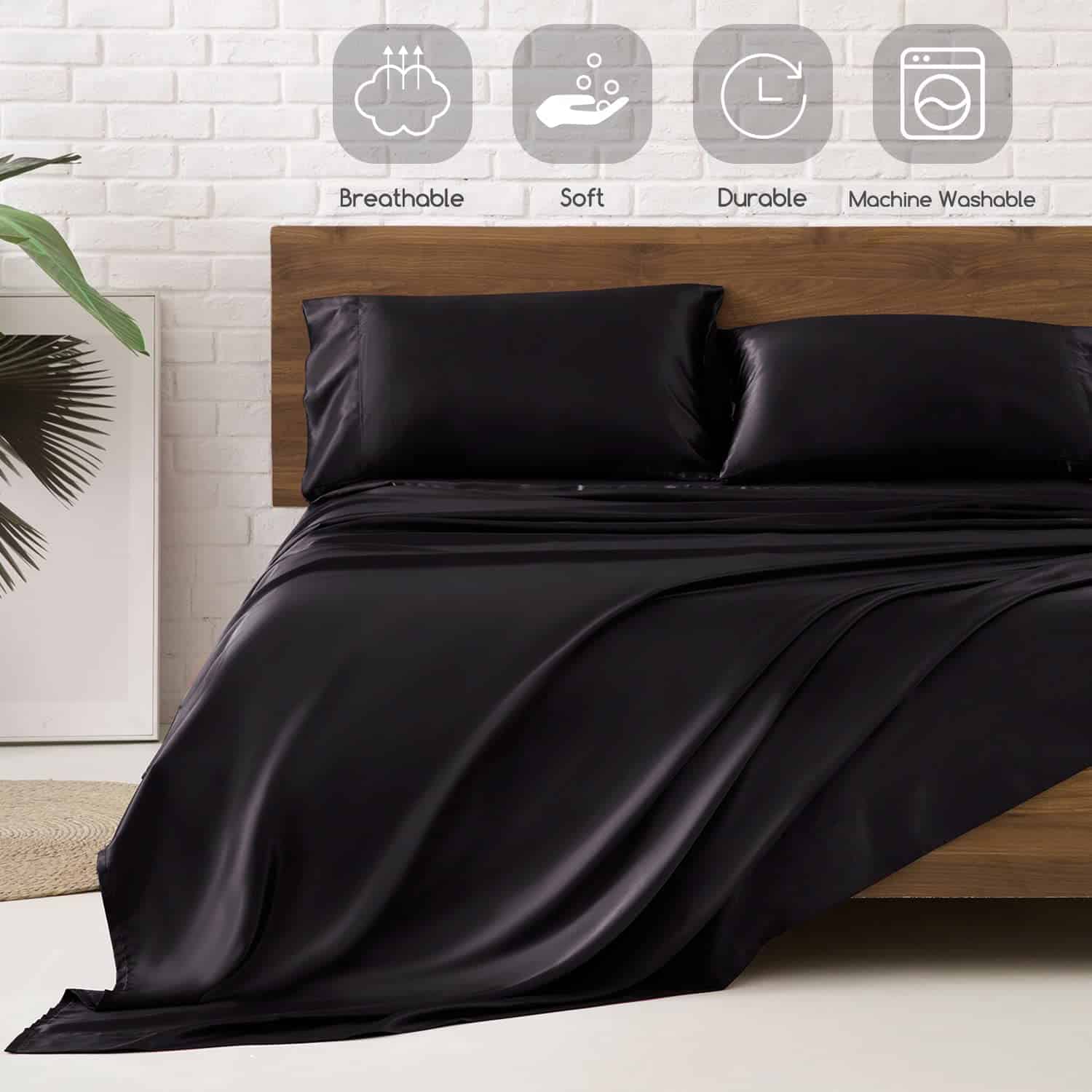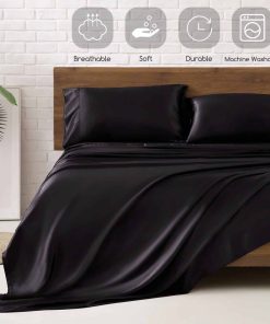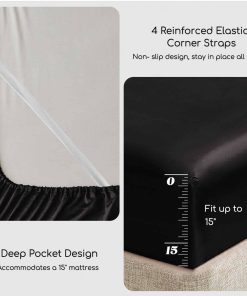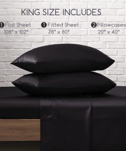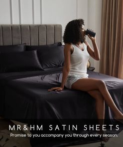 MR&HM presenta su juego de sábanas de satén king size de 4 piezas, perfectas para brindarle una experiencia de sueño de lujo a un precio asequible. El paquete incluye una sábana plana de 108″x 102″, una sábana ajustable de 78″x 80″ con un bolsillo profundo de 15″, y dos fundas de almohada de 20″x 40″. Las correas elásticas reforzadas en las esquinas envuelven su colchón de forma segura, resolviendo los problemas de deslizamiento del satén y permitiéndole disfrutar de una noche suave y confortable.