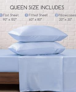 1. Juego de sábanas tamaño Queen de 4 piezas: Nuestro paquete incluye 1 Sábana plana: 90″x102″, 1 Sábana ajustable: 60″x80″ + 15″ de bolsillo profundo, 2 Fundas de almohada: 20″x30″. Las correas elásticas reforzadas en las esquinas envuelven de forma segura su colchón, resolviendo sin esfuerzo los problemas de deslizamiento de satén y permitiéndole disfrutar de una noche suave y cómoda.