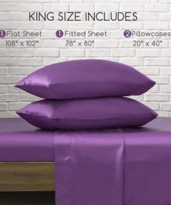 1. Juego de sábanas tamaño King de 4 piezas: Nuestro paquete incluye 1 Sábana Plana: 108» x 102», 1 Sábana Ajustable: 78» x 80» + Bolsillo profundo de 15», 2 Fundas de Almohada: 20» x 40». Las correas elásticas de las esquinas reforzadas envuelven de forma segura su colchón, resolviendo sin esfuerzo los problemas de deslizamiento del satén y permitiéndole disfrutar de una noche suave y cómoda.