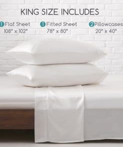 1. Tamaño del juego de sábanas King de 4 piezas: Nuestro paquete incluye 1 sábana plana: 108″x102″, 1 sábana ajustable: 78″x 80″ + bolsillo profundo de 15″, 2 fundas de almohada: 20″x40″. Las correas elásticas reforzadas en las esquinas envuelven de forma segura su colchón, resolviendo sin esfuerzo los problemas de deslizamiento del satén y permitiéndole disfrutar de una noche suave y cómoda.