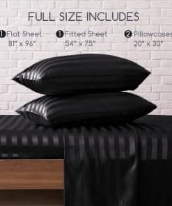 1. Juego de sábanas de tamaño completo de 4 piezas: Nuestro paquete incluye 1 Sábana Plana: 81 «x 96 «, 1 Sábana Ajustable: 54» x 75 «+ 15″ Bolsillo Profundo, 2 Fundas de Almohada: 20″ x 30». Correas elásticas reforzadas en las esquinas envuelven de forma segura su colchón, resolviendo fácilmente los problemas de deslizamiento del satén y permitiéndole disfrutar de una noche suave y cómoda.