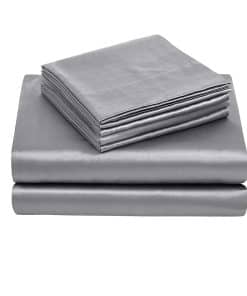 3. Juego de sábanas King de bolsillo profundo: la tela de satén es lo suficientemente transpirable para mantenerse fresca en el verano y calentarse en el invierno frío. Con elástico en todo, la sábana ajustada de bolsillo profundo se puede estirar para adaptarse perfectamente a tu colchón. Se adapta a colchones de hasta 15″. Debido a su textura ultra suave que a veces la hace fácil de deslizar, necesitas ajustarla.