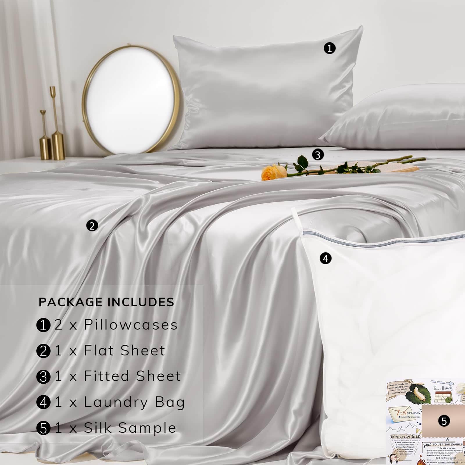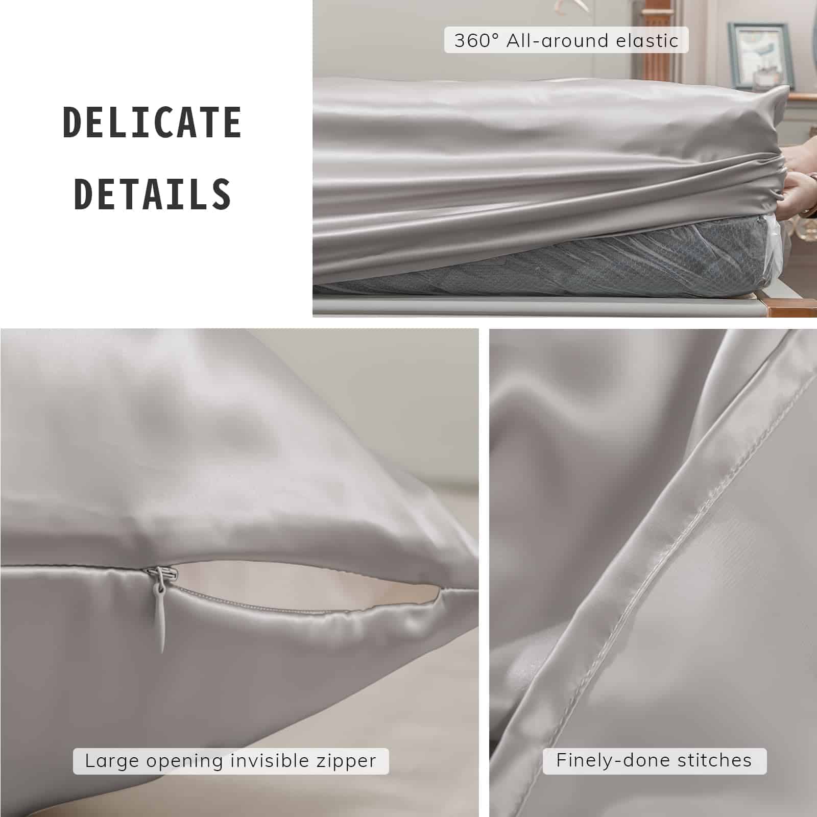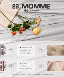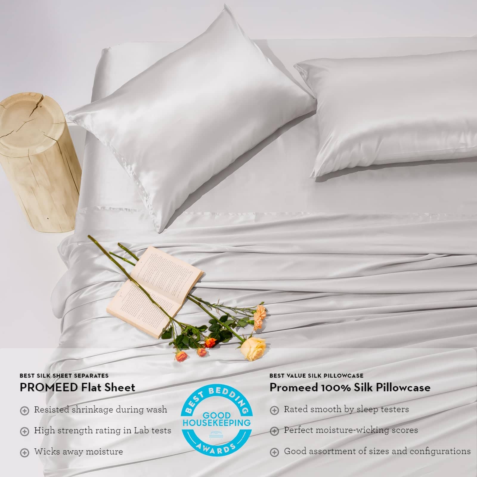 Este juego de sábanas de seda PURA PROMEED es la adición perfecta para tu dormitorio. Las sábanas están hechas con la más alta calidad de seda de morera Grado 6A+, que es suave, refrescante y no absorbente. La seda natural es ultra transpirable, lo que previene los brotes y reduce las arrugas del sueño. Las sábanas de seda PROMEED han sido galardonadas con los premios GOOD HOUSEKEEPING BEDDING AWARDS 2024 por su suavidad y puntajes perfectos de absorción de humedad.