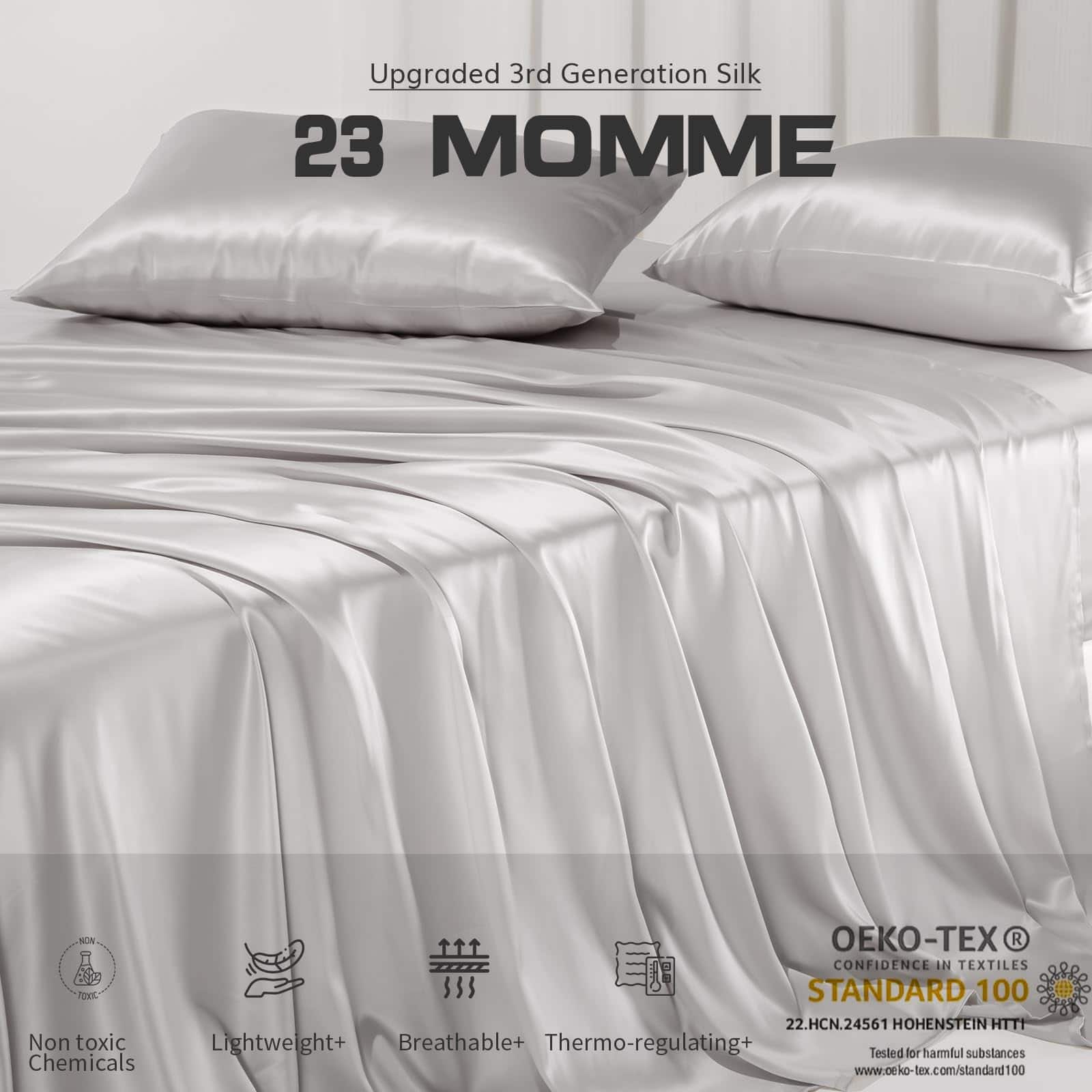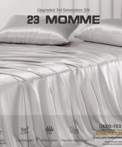 Además, estas sábanas de seda son certificadas por OEKO-TEX STANDARD 100, lo que garantiza que estén libres de productos químicos nocivos. El juego incluye una sábana plana, una sábana ajustable y fundas de almohada, todo lavable a máquina para una fácil limpieza. Las fibras de seda natural ayudan a regular la temperatura corporal, lo que puede reducir la sudoración excesiva y ralentizar los sofocos no deseados.