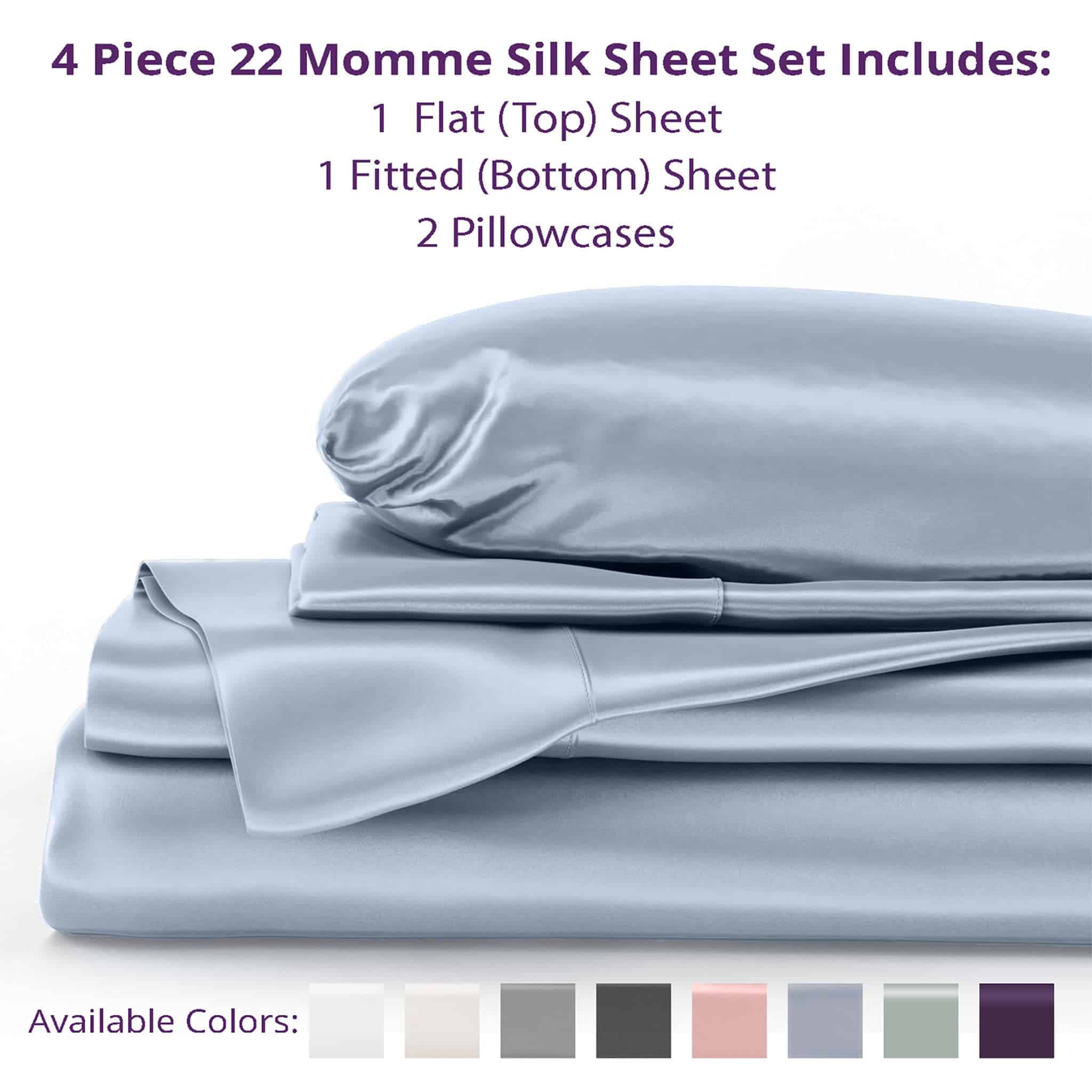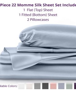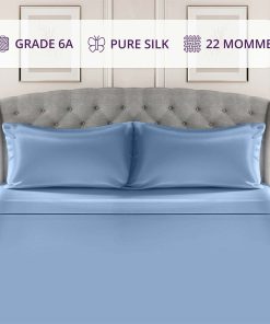 1. Juego completo de sábanas de seda: Nuestro juego de sábanas de seda de 4 piezas incluye una sábana plana, una sábana ajustable y dos fundas de almohada de seda de doble cara con cierres de estilo sobres en bolsa extra profunda. La sábana ajustable de 16″ es sin costuras y completamente elástica para un ajuste ceñido en colchones de hasta 14″ de profundidad.