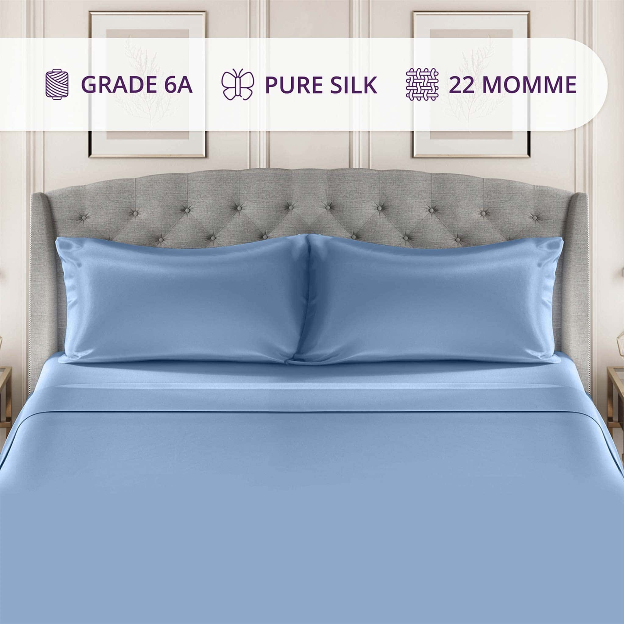 2. 100% Seda Premium grado 6A de morera: Hecho de las fibras de seda de morera más finas, suaves y fuertes, nuestra ropa de cama de seda ofrece un lujo inigualable. Nuestra artesanía superior está en los detalles. Nuestras sábanas planas están terminadas con un amplio borde en la cabeza de la sábana, las costuras de nuestras fundas de almohada y las esquinas de nuestras sábanas ajustables están terminadas con costuras francesas para mayor durabilidad, y nuestras fundas de almohada tienen un cierre en bolsa extra profundo.