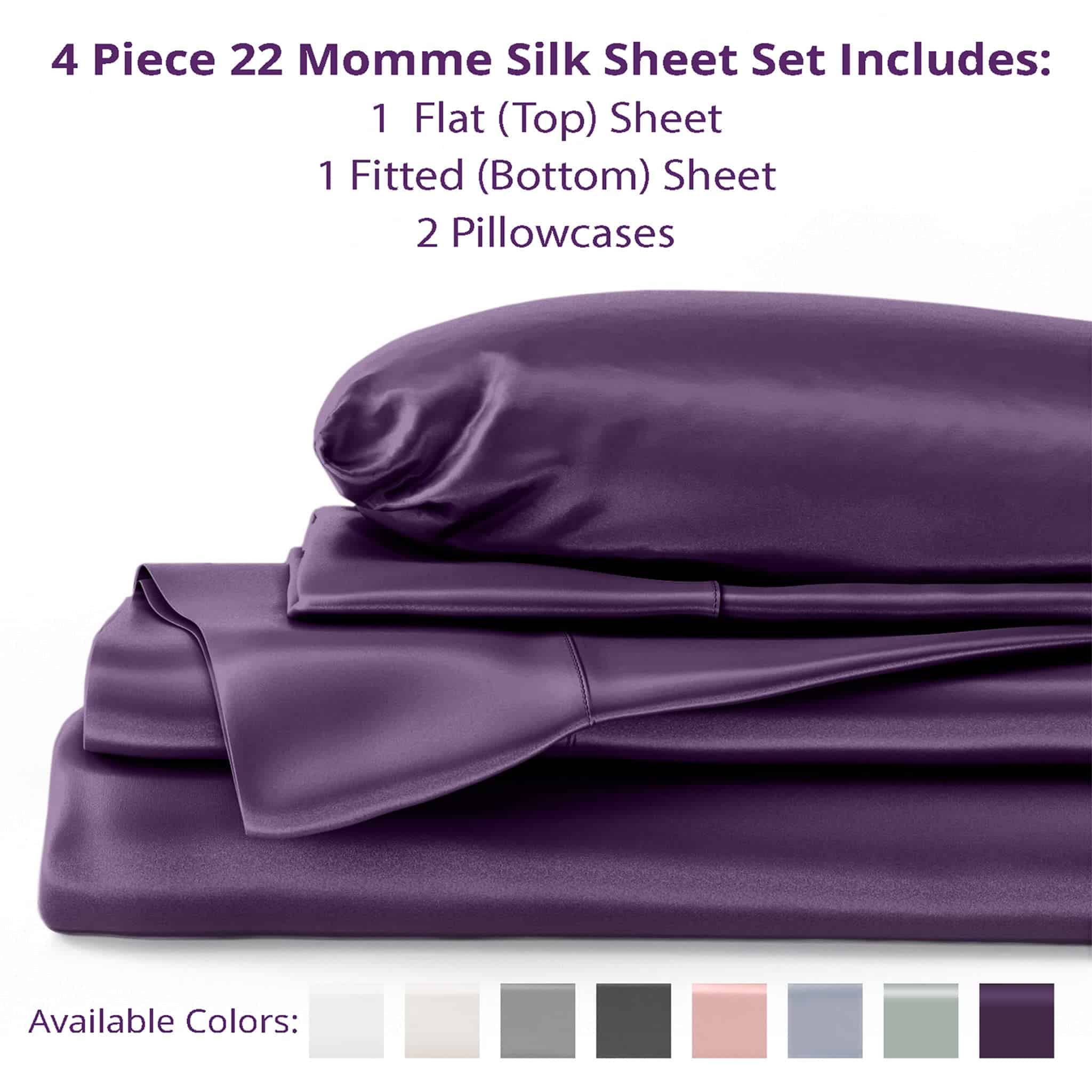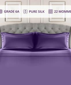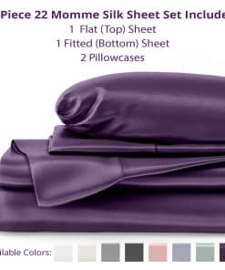 1. Juego completo de sábanas de seda: Nuestro juego de sábanas de seda de 4 piezas incluye una sábana plana, una sábana ajustable y dos fundas de almohada de seda de doble cara con cierres de sobre con cierre extra profundo. La sábana ajustable de 16″ es sin costuras y completamente elástica para un ajuste ajustado en colchones de hasta 14″ de profundidad.