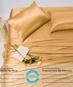 El juego de sábanas de seda 100% Promeed incluye 1 sábana ajustable, 1 sábana plana y 1 funda de almohada, todo hecho con seda de mora de la más alta calidad de Grado 6A+ de 23 momme. Certificado por OEKO-TEX STANDARD 100, este juego de sábanas es suave, refrescante y no absorbente, perfecto para pieles sensibles. Las suaves sábanas de seda ayudan a prevenir brotes y reducir arrugas mientras duermes, además de ser recomendadas por expertos en belleza y salud para mantener un cabello sano y una piel hidratada. La tela de 23 momme de seda PROMEED es fuerte y resistente a la contracción, según los evaluadores de Good Housekeeping, lo que garantiza su durabilidad. Además, la gestión de la humedad demostró ser excelente, lo que ayuda a reducir la sudoración excesiva y disminuir los sofocos indeseados. Las sábanas de seda Promeed son fáciles de cuidar, lavables a máquina en ciclo suave y permanecen suaves al tacto incluso después de varios lavados. Incluye instrucciones detalladas de cuidado para garantizar que mantengan su calidad a lo largo del tiempo.
