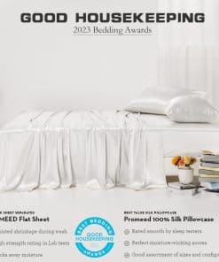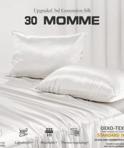 El juego de sábanas de seda de morera de lujo de 30 Momme de PROMEED ofrece una experiencia de sueño de primera calidad. Ganador del premio GOOD HOUSEKEEPING BEDDING AWARDS 2022, este juego de sábanas es clasificado como suave por los probadores de sueño y cuenta con puntuaciones perfectas de absorción de humedad. Fabricado con la más alta calidad de Seda de Morera Grado 6A+, esta ropa de cama es súper suave, refrescante y no absorbente, lo que la hace ultra transpirable, previniendo brotes y reduciendo las arrugas del sueño. Además, el juego de sábanas Promeed ayuda a mantener tu cabello sano y sin frizz, y tu piel hidratada gracias a las propiedades restauradoras de la seda de morera. Las fibras reguladoras de temperatura mantienen tu piel fresca y seca durante la noche, previniendo el acné y las arrugas. Este juego de sábanas es fácil de cuidar, ya que es lavable a máquina en ciclo suave e incluye una bolsa de lavandería. Disfruta de la suavidad y la elegancia de las sábanas de seda de morera de PROMEED para un sueño reparador y rejuvenecedor.