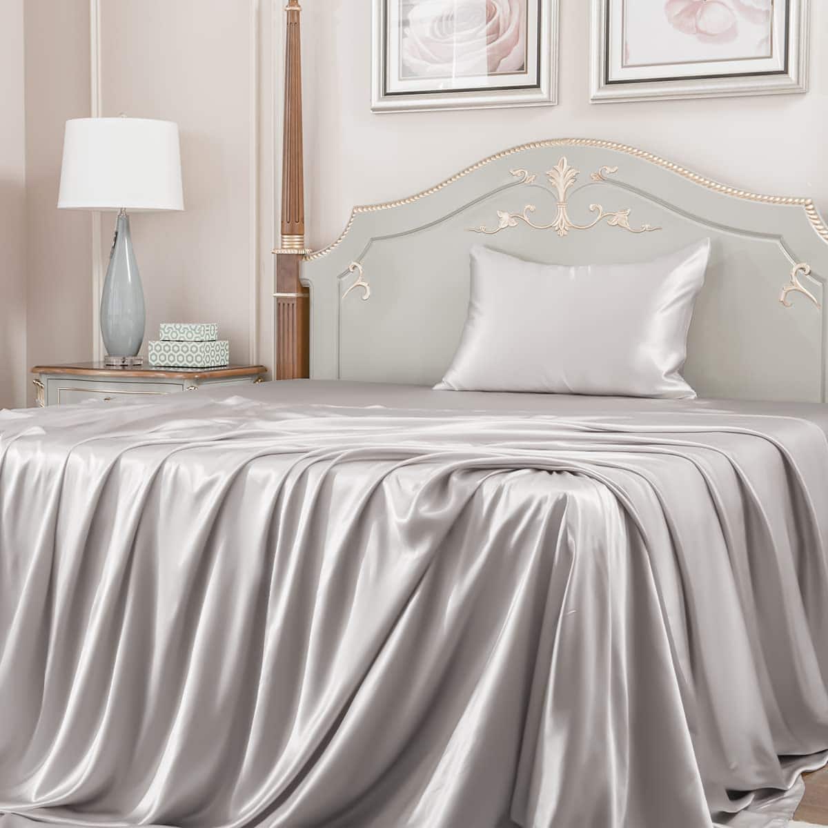La sábana de seda Promeed de 23 Momme es un juego de sábanas de lujo que proporciona la máxima comodidad y beneficios para su piel y cabello durante el sueño. Hecho con la más alta calidad de seda de morera Grade 6A+, este juego de sábanas incluye una sábana plana, una sábana ajustable de bolsillo profundo y fundas de almohada a juego, todo en un elegante color Gris Claro.