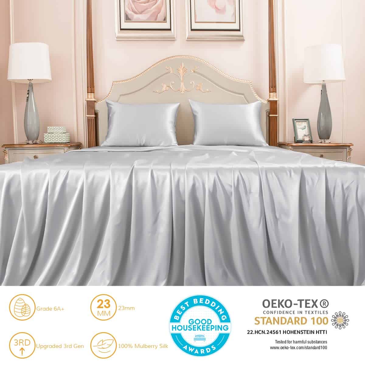 El juego de sábanas ha sido galardonado con el premio GOOD HOUSEKEEPING BEDDING AWARDS 2023, clasificado como suave por probadores del sueño y con puntuaciones perfectas en control de humedad. El certificado OEKO-TEX ESTÁNDAR 100 garantiza que el material utilizado en estas sábanas de seda es seguro para la piel y el medio ambiente.