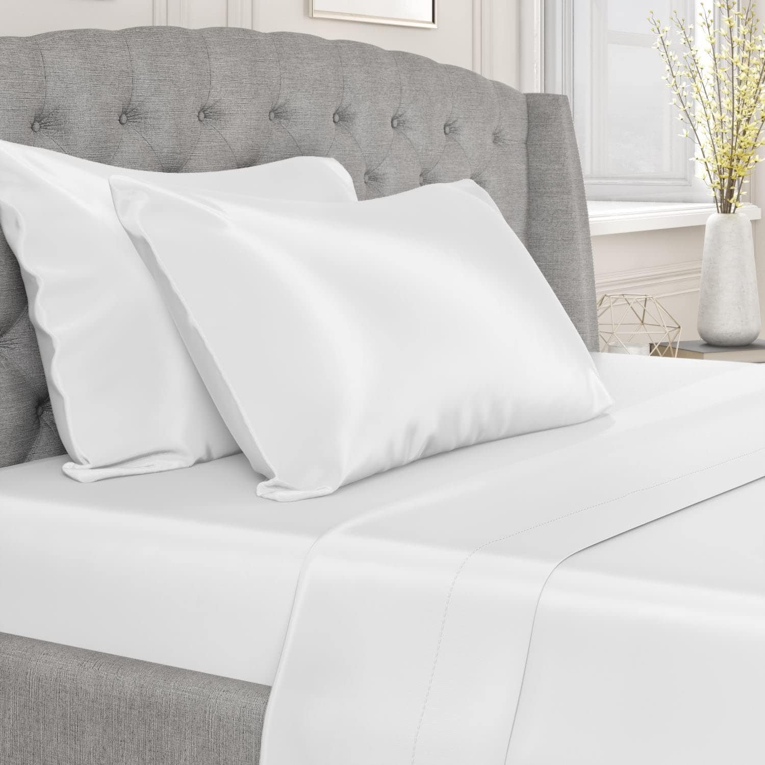 2. 100% SEDA DE MORERA DE GRADO 6A DE PRIMERA CALIDAD: Hecho con las mejores fibras de seda de morera, nuestra ropa de cama de seda ofrece un lujo incomparable. Nuestra mano de obra superior se refleja en los detalles. Nuestras sábanas planas tienen un amplio borde en la cabecera de la sábana, las costuras de nuestras fundas de almohada y las esquinas de nuestras sábanas ajustables tienen costuras francesas para mayor durabilidad, y nuestras fundas de almohada tienen un cierre de sobre extra profundo.
