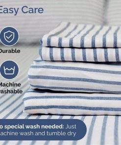 Juego de sábanas de tamaño Cal King de 4 piezas en rayas azules. Incluye 2 fundas de almohada, sábana encimera y sábana ajustable. Las sábanas son transpirables, frescas y súper suaves. Tienen bolsillos profundos y un ajuste fácil que se adapta a colchones de hasta 16 pulgadas de profundidad. Ideales para cualquier habitación de la casa, incluyendo dormitorio, habitación de invitados, habitación de niños, RV y casa de vacaciones. Las sábanas están hechas de microfibra cepillada de alta calidad para un toque suave y ligero. Son algunas de las sábanas más suaves y asequibles que encontrarás. ¡Aprovecha esta oportunidad de tener sábanas cómodas y suaves a un precio razonable!