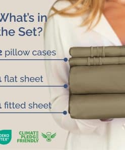 Transforma tu dormitorio en un lujoso refugio con este juego de sábanas de tamaño Cal King. Con una sábana plana, una sábana ajustable y dos fundas de almohada, este juego de sábanas te ofrece todo lo que necesitas para una cama cómoda y elegante. La suave microfibra cepillada es más transpirable y confortable que el algodón, garantizando una noche de sueño reparador. Gracias al bolsillo extra profundo de la sábana ajustable, se adapta a colchones de hasta 16 pulgadas de profundidad. El material resistente a las arrugas hace que hacer la cama sea rápido y sencillo, mientras que las sábanas lavables a máquina son duraderas y mantienen su color incluso después de múltiples lavados. Disfruta de una ropa de cama de calidad de hotel con este juego de sábanas Khaki certificado por Oeko-Tex.
