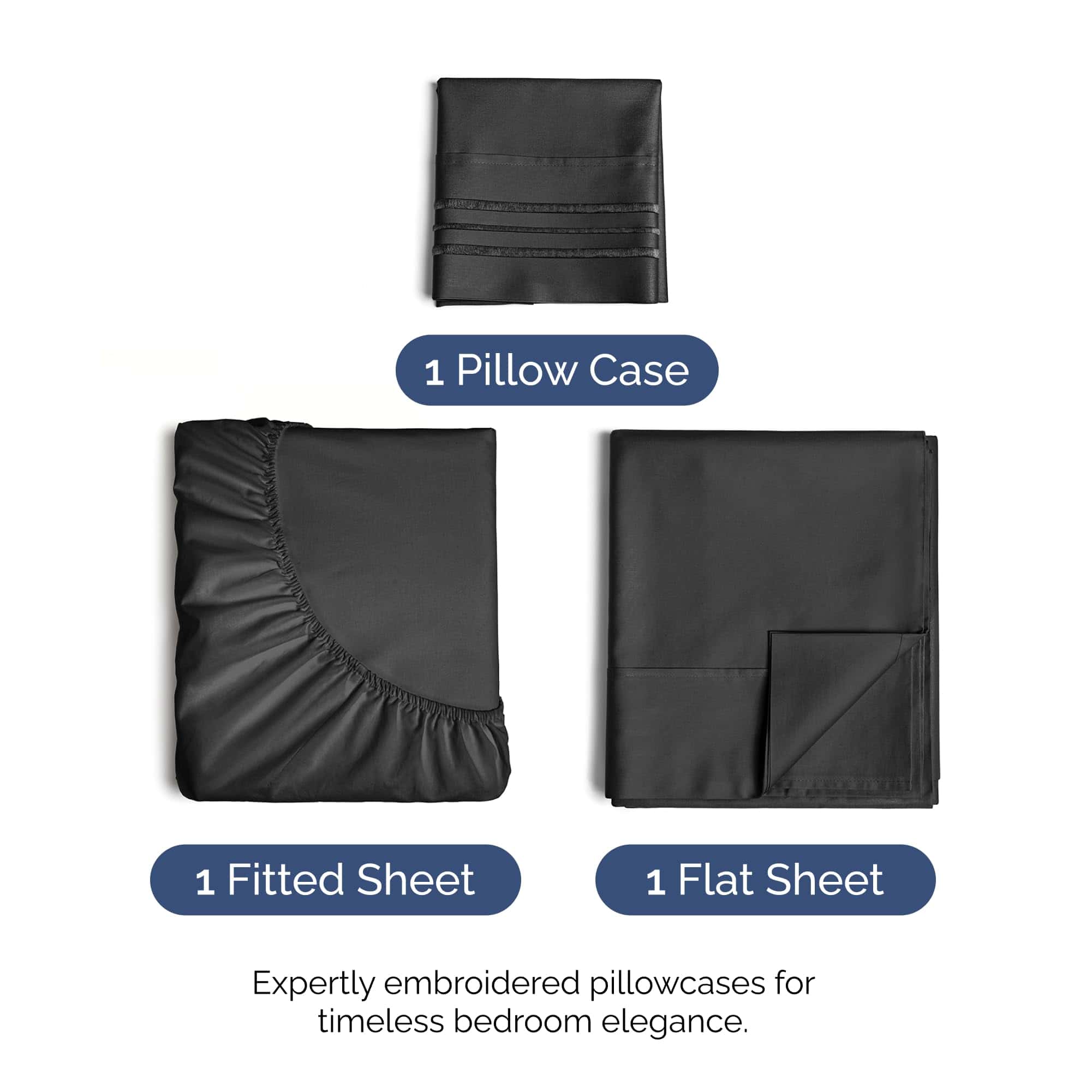 1. JUEGO DE SÁBANAS DE 3 PIEZAS: 1 funda de almohada, sábana plana y sábana ajustable. Sábana plana (66″x 102″) Sábana ajustable (39″x 80″) 1 Funda de Almohada (20 x 30)