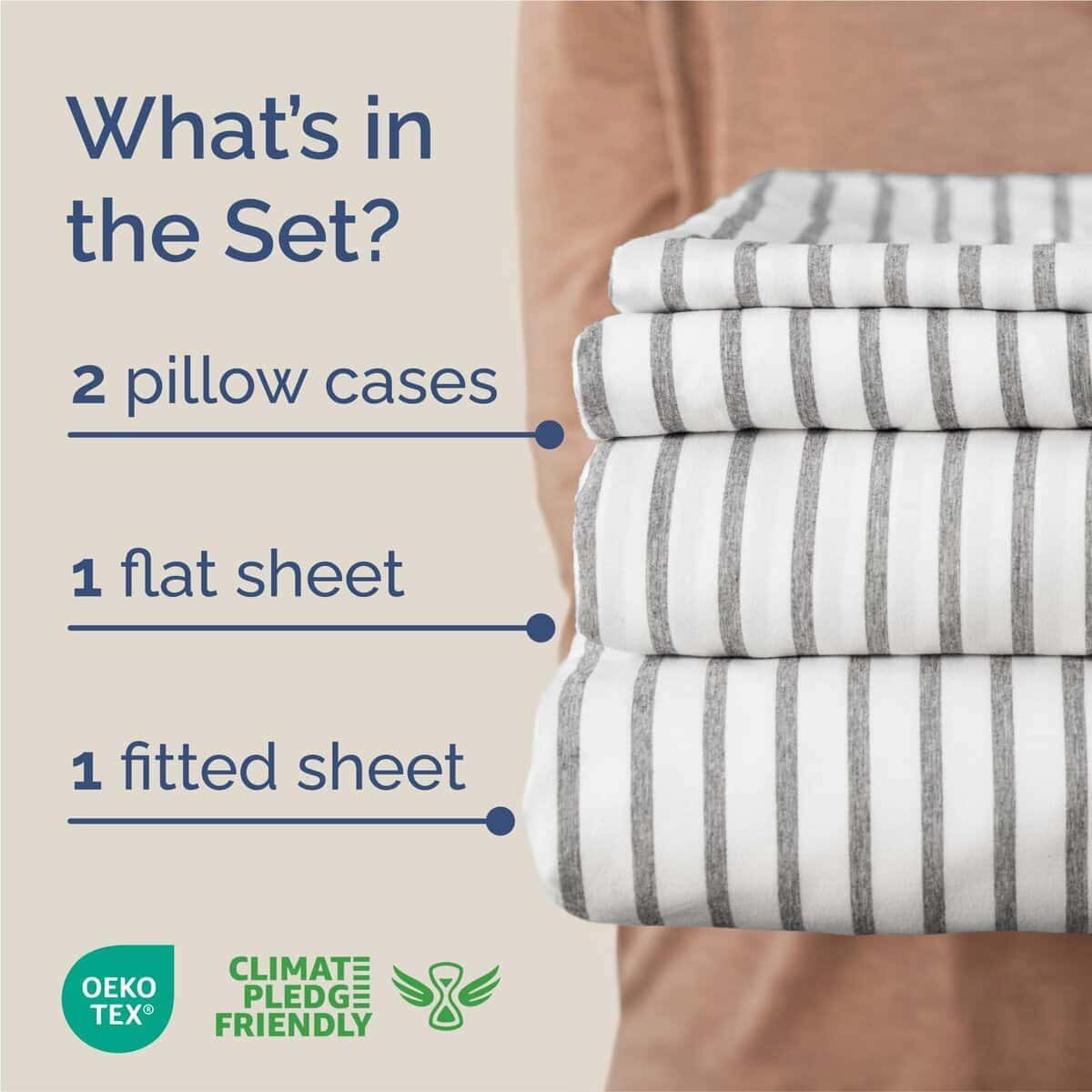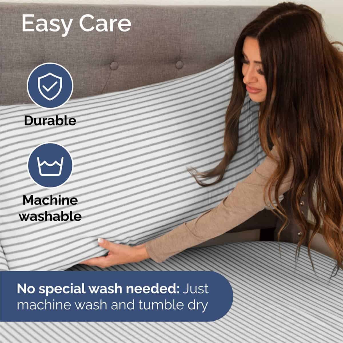 Juego de sábanas de 4 piezas de tamaño King en rayas grises, perfecto para todas las edades y géneros. Incluye 2 fundas de almohada, una sábana plana y una sábana ajustable. Las sábanas tienen bolsillos profundos que se adaptan a colchones de hasta 16 pulgadas de profundidad, lo que las hace adecuadas para la mayoría de los colchones estándar del mercado. Son increíblemente suaves y transpirables, proporcionando una sensación fresca y sedosa al tacto. Fabricadas con microfibra cepillada de la más alta calidad, estas sábanas ofrecen un toque fino y ligero que te hará regresar por más. Ideales para cualquier habitación de la casa, ya sea dormitorio, habitación de invitados, habitación de niños, RV o casa de vacaciones. Disfruta de la comodidad y suavidad de las sábanas CGK Unlimited a un precio asequible. ¡Haz de tu cama un lugar acogedor y relajante con este juego de sábanas de lujo!